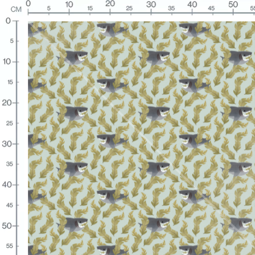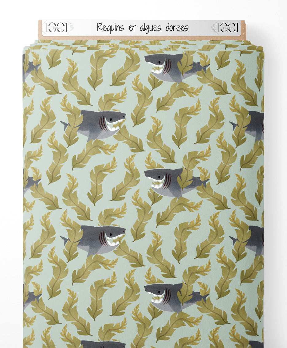 Les requins sont représentés avec des nuances de gris et des détails blancs sur les dents. Les algues dorées ajoutent une touche naturelle au motif marin.Les tissus