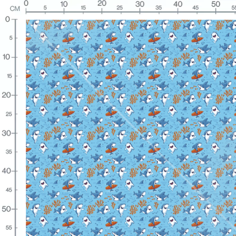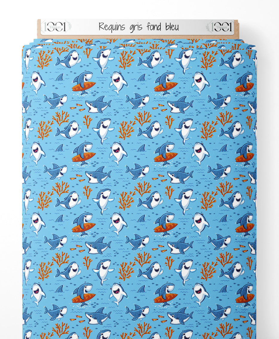Les requins affichent des expressions variées et nagent autour de petits poissons. Le fond bleu clair évoque un environnement marin paisible.Les tissus