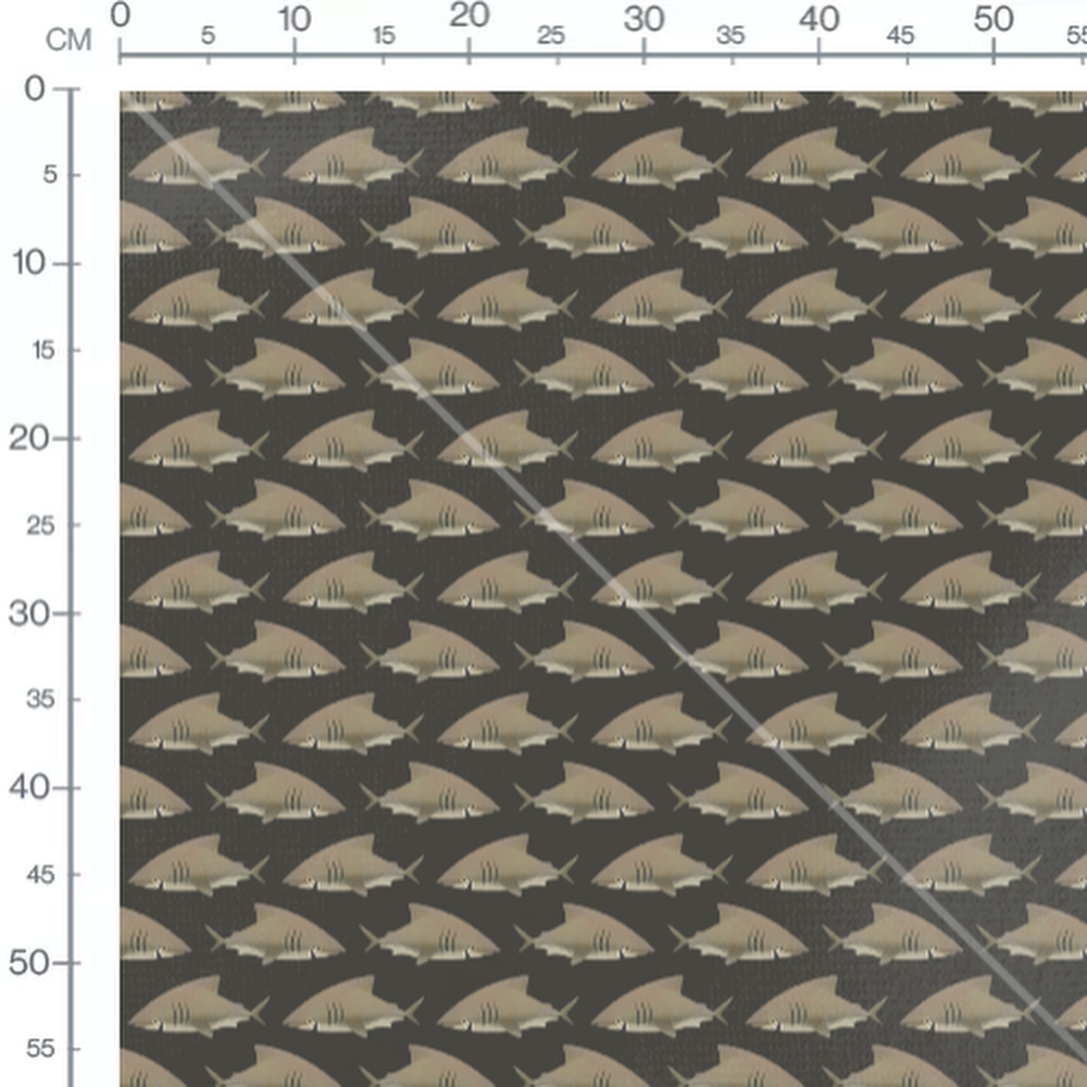 Les requins sont dessinés avec des nuances de gris et des rayures noires. Le fond noir met en valeur les détails des requins. Les nageoires et les yeux sont bien définis, ajoutant du caractère au motif.Les tissus