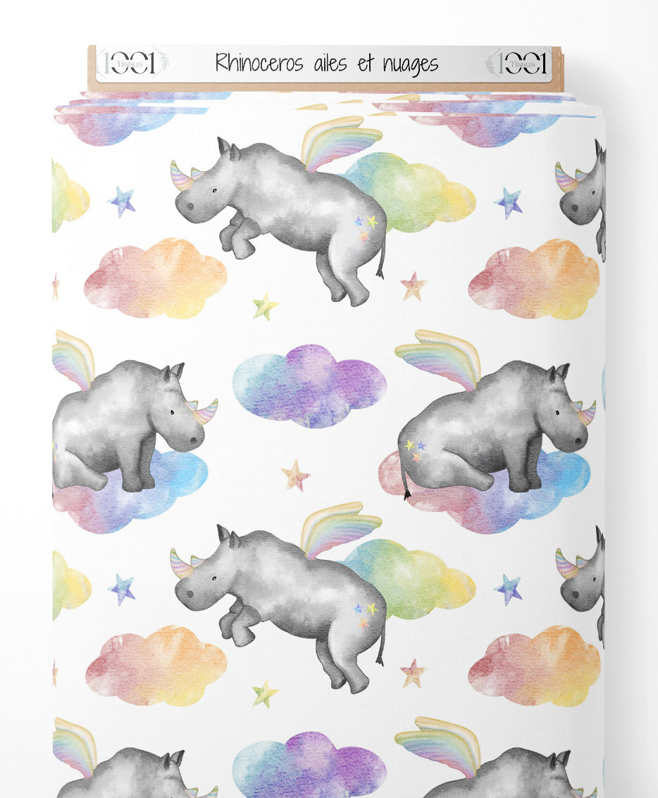 Les rhinocéros ont des ailes arc-en-ciel et des cornes multicolores. Les nuages sont dans des tons pastel de rose, bleu et jaune. Des petites étoiles colorées ajoutent une touche de magie au motif.Les tissus