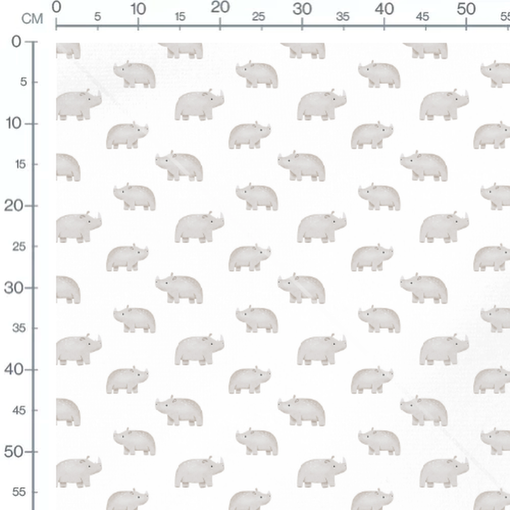 Les rhinocéros sont représentés avec des oreilles et des yeux noirs. Le motif est répétitif et uniforme sur l'ensemble du fond.Les tissus