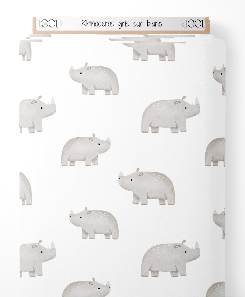 Tissu - Rhinocéros gris sur blanc