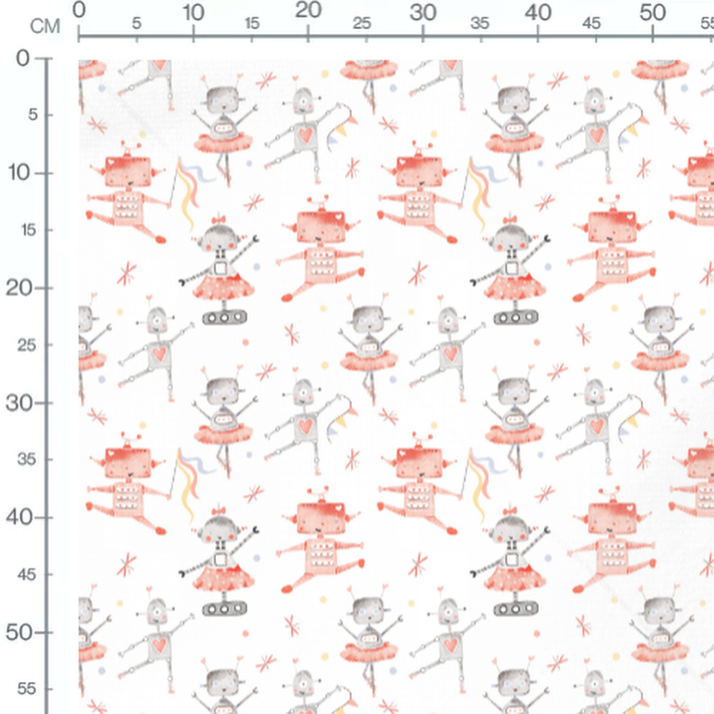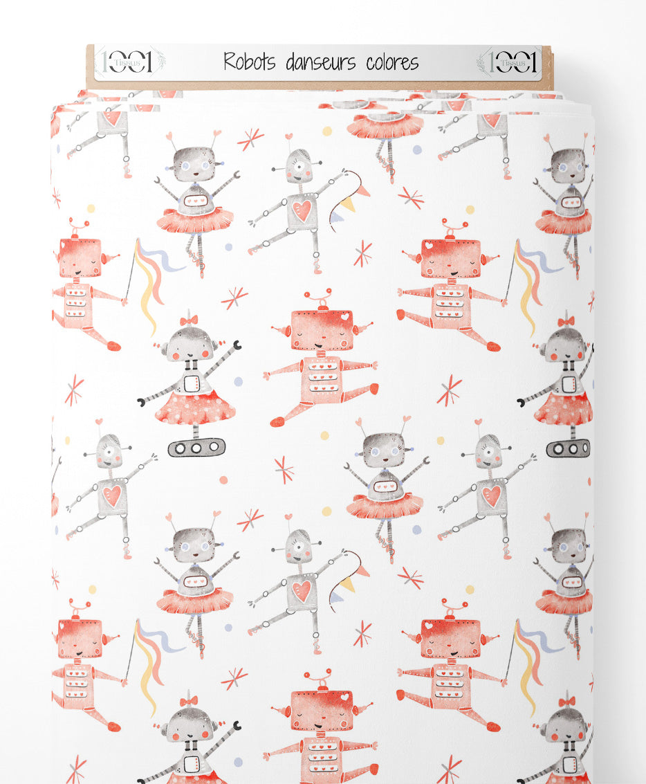 Les robots portent des jupes rouges et tiennent des drapeaux multicolores. Des motifs de cœurs et d'étoiles ajoutent une touche ludique. Les robots ont des antennes et des visages souriants.Les tissus