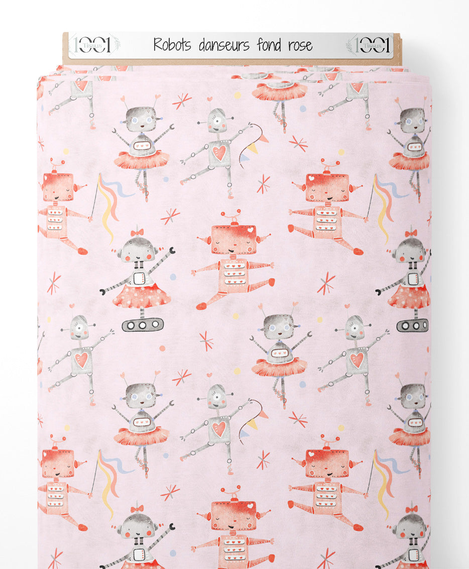 Certains robots portent des jupes rouges et tiennent des drapeaux colorés. Les robots ont des antennes et des motifs de cœur sur le corps. Le fond rose est parsemé de petites étoiles et de points multicolores.Les tissus
