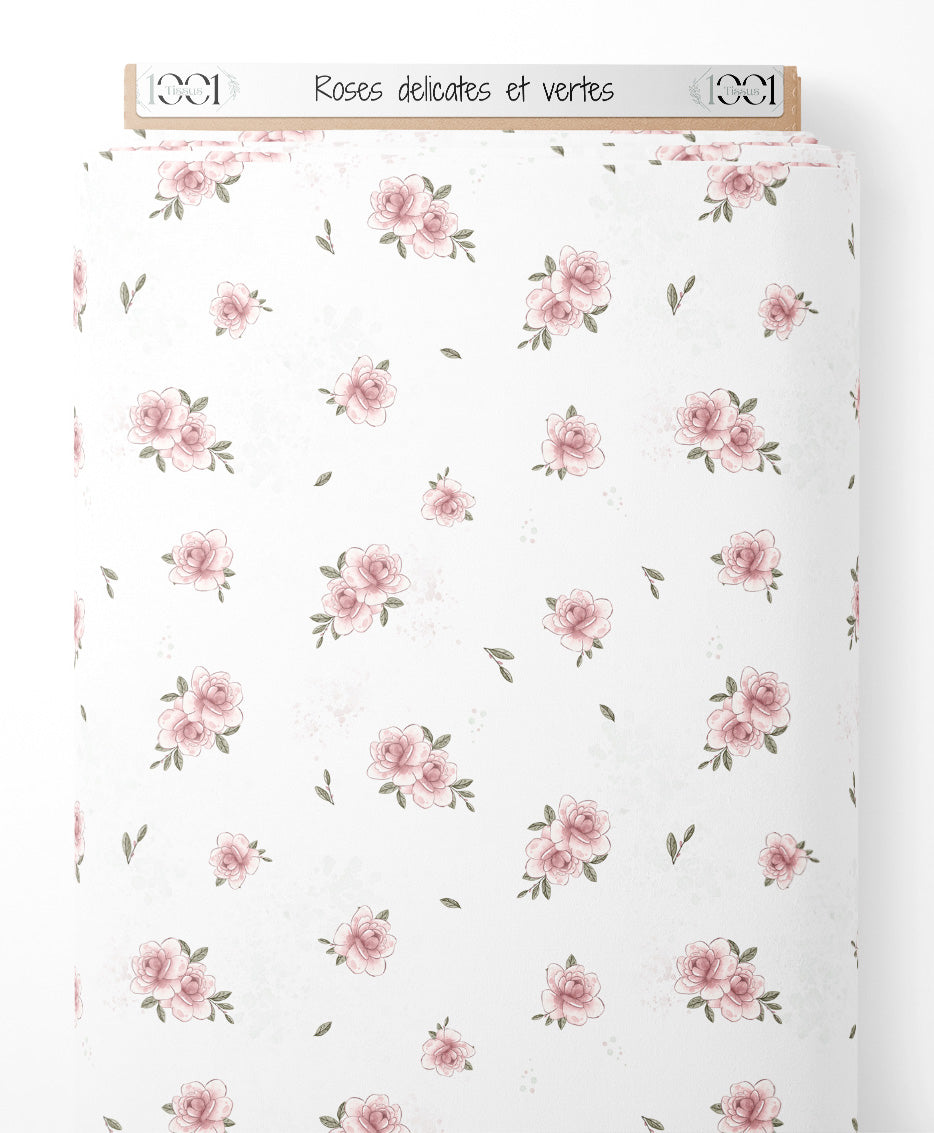 Les roses sont délicatement dessinées avec des nuances de rose. Les feuilles vertes ajoutent un contraste subtil. Le fond blanc met en valeur la douceur des couleurs. Quelques petites feuilles sont dispersées entre les roses.Les tissus
