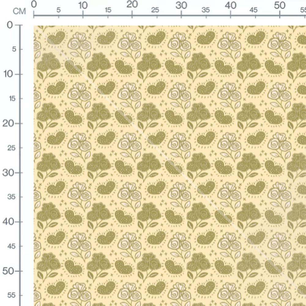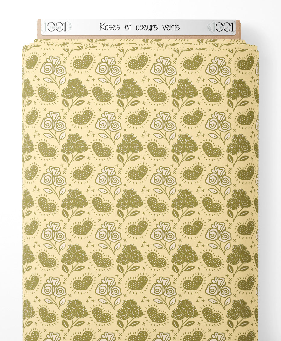 Les roses sont dessinées avec des lignes simples et des détails en pointillés. Les cœurs verts sont parsemés de petits points blancs. Le fond beige est agrémenté de petites croix dispersées.Les tissus
