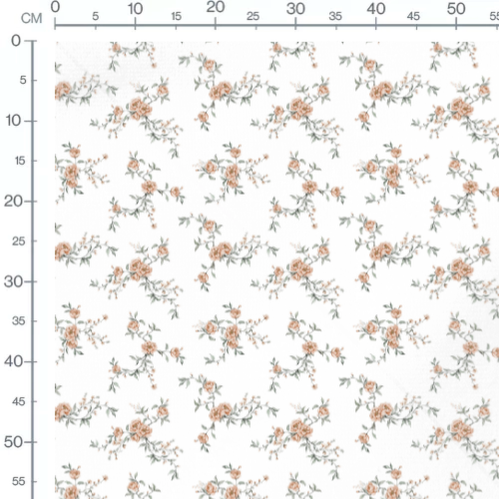 Les roses sont accompagnées de petites feuilles vertes. Les branches fleuries ajoutent une touche délicate au motif.Les tissus