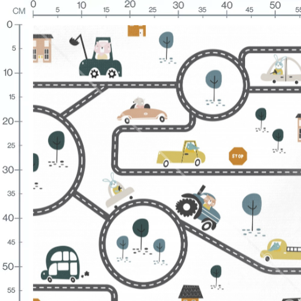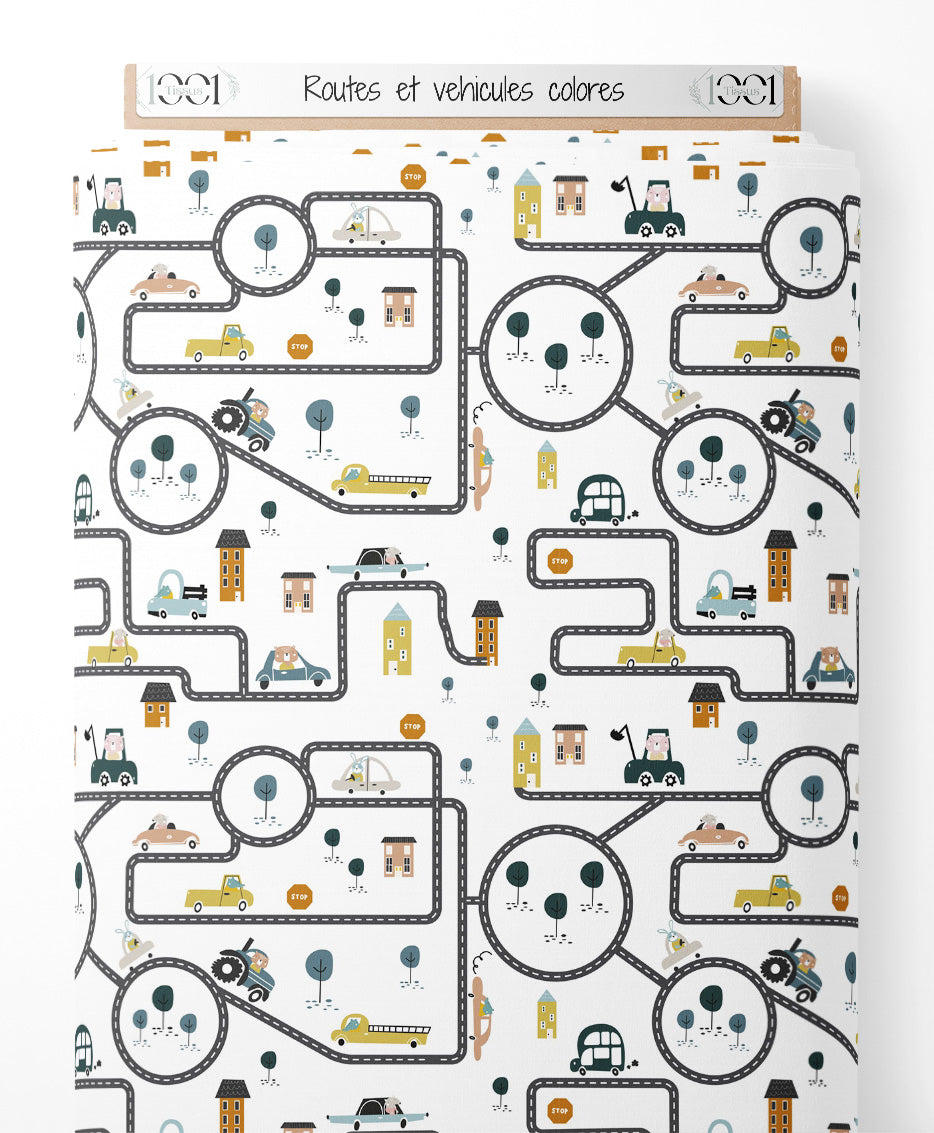Les routes grises serpentent à travers le motif. Les véhicules incluent des voitures, un tracteur et un camion. Des arbres ronds et des maisons de différentes couleurs complètent le décor.Les tissus