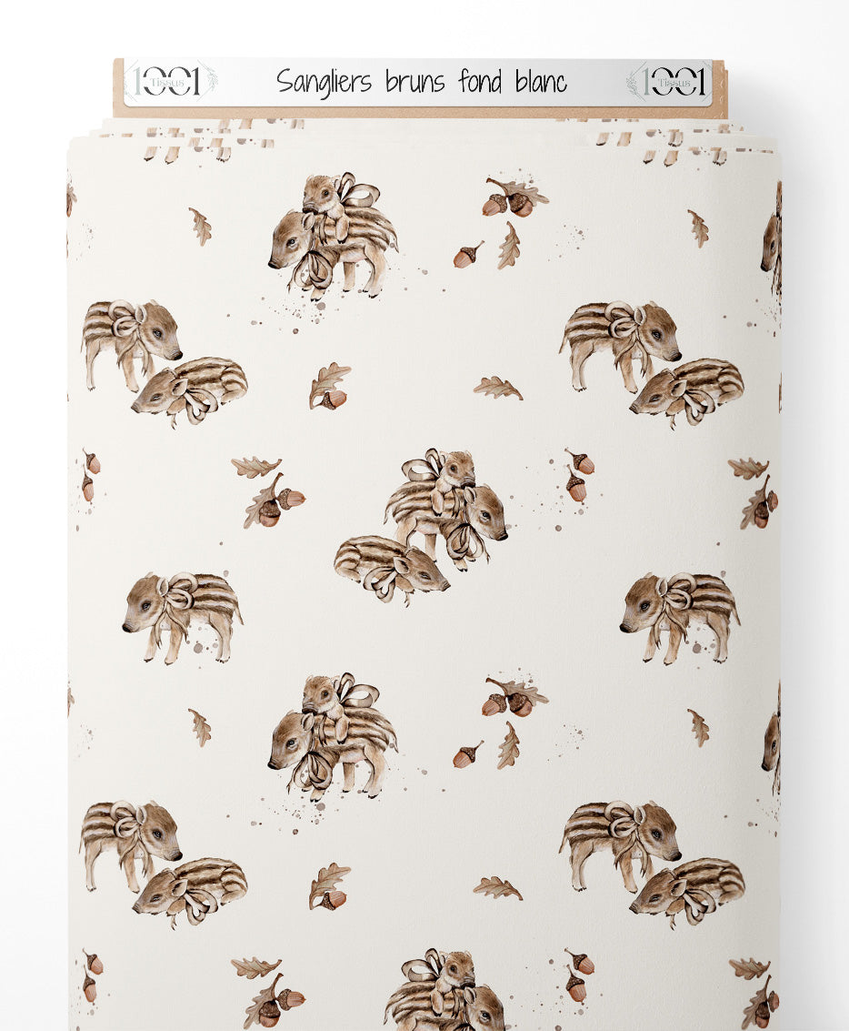 Les petits sangliers sont illustrés avec des détails réalistes et des nuances de brun. Les glands et les feuilles de chêne ajoutent une touche naturelle au motif. Le fond blanc met en valeur les éléments dessinés.Les tissus