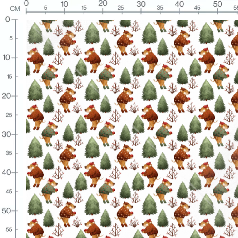Les sangliers portent des pulls colorés et tiennent des pommes rouges. Les sapins verts sont dispersés sur le fond. Des branches nues marron ajoutent un détail hivernal au motif.Les tissus