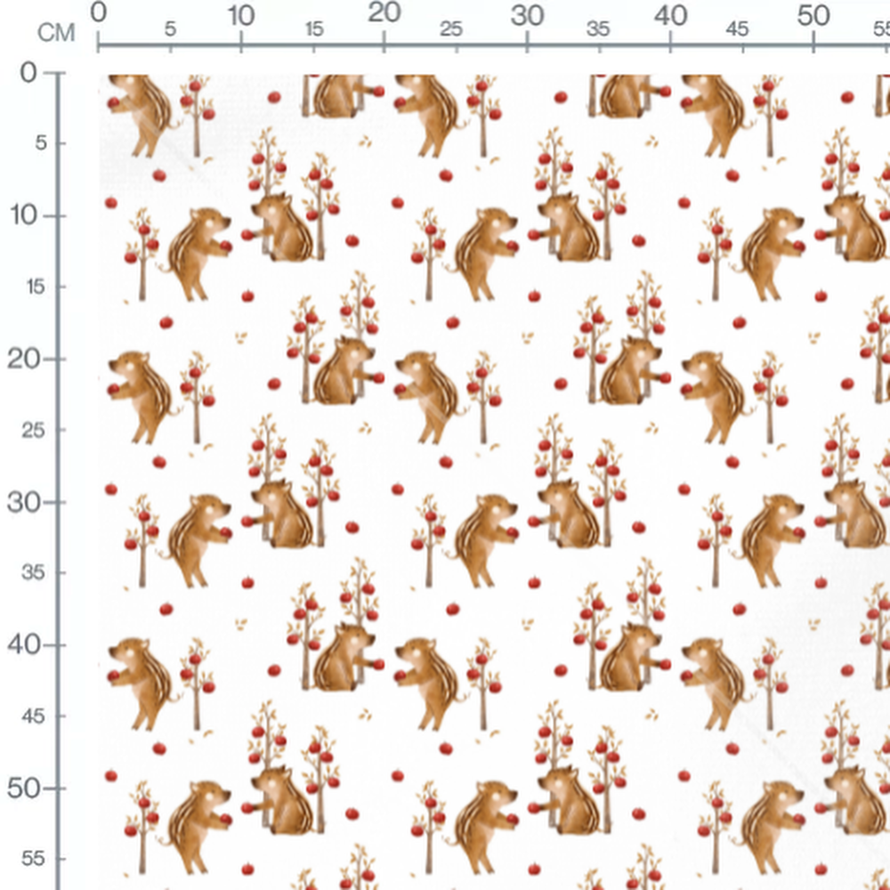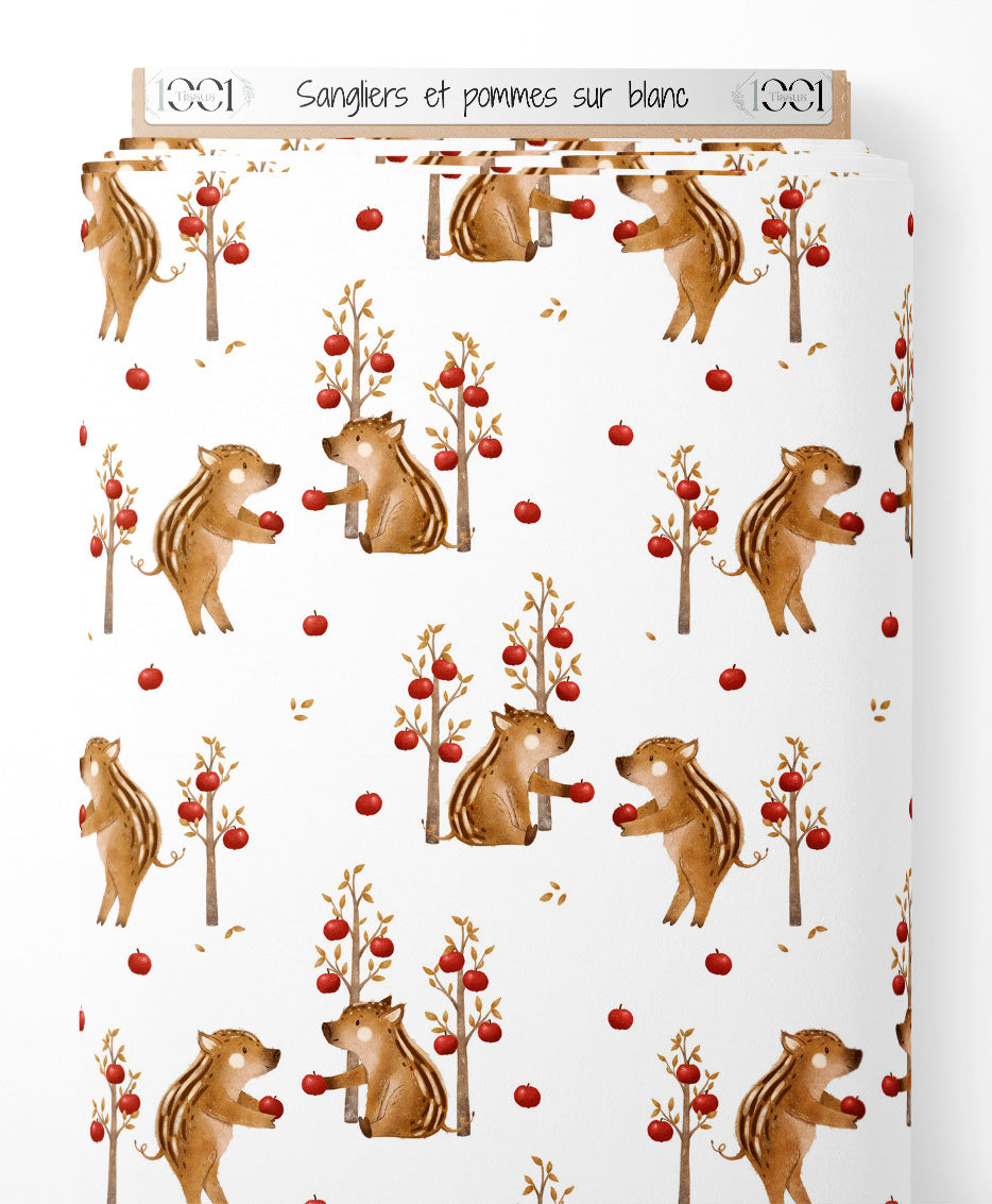 Les sangliers sont dessinés dans des tons bruns avec des rayures claires. Les arbres sont fins avec des pommes rouges et des petites feuilles dorées. Des pommes rouges sont dispersées autour des sangliers et des arbres.Les tissus