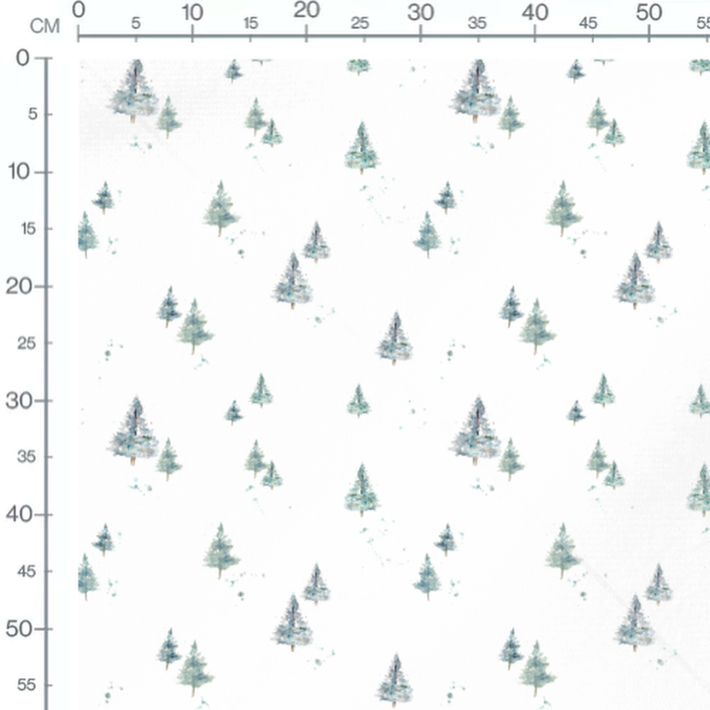 Les sapins sont peints dans des nuances de vert et de bleu. Le fond blanc met en valeur les touches aquarelle qui ajoutent une texture douce.Les tissus