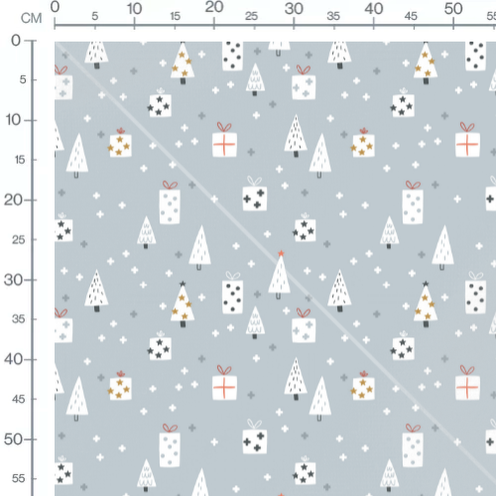 Les sapins sont décorés de motifs étoilés. Les cadeaux sont ornés de rubans rouges et motifs variés.Les tissus