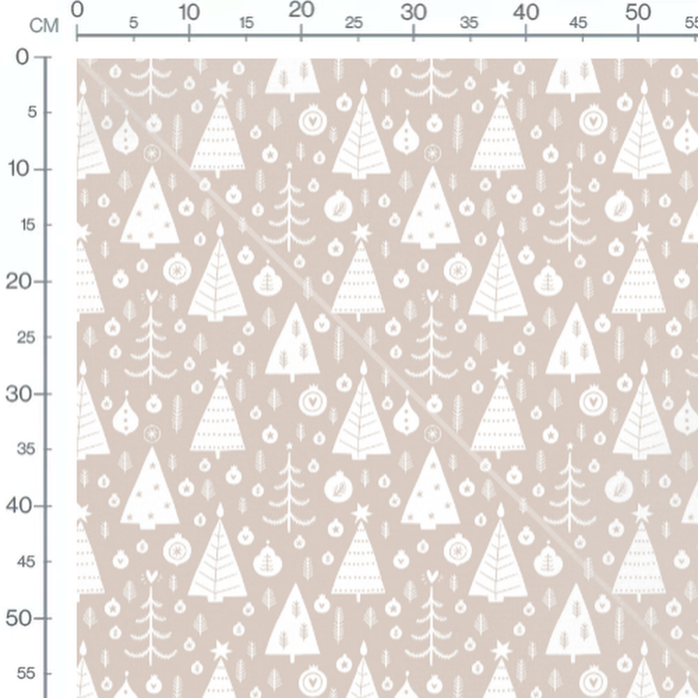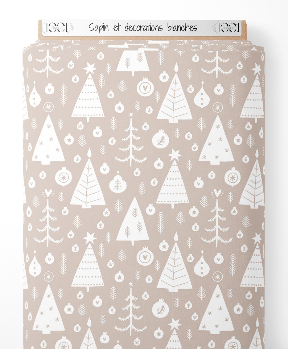 Différents sapins blancs stylisés sur fond beige. Boules de Noël blanches dispersées sur le fond. Petites étoiles blanches ajoutent un détail festif. Branches de sapin blanches entre les motifs principaux.Les tissus