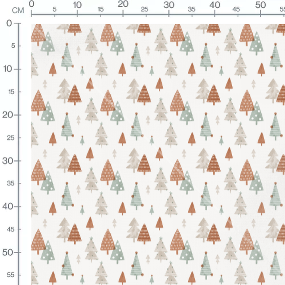 Les sapins sont de différentes tailles et formes. Certains sapins ont des motifs de points blancs, d'autres des lignes blanches. Les couleurs principales sont le vert pastel, le beige et le brun.Les tissus