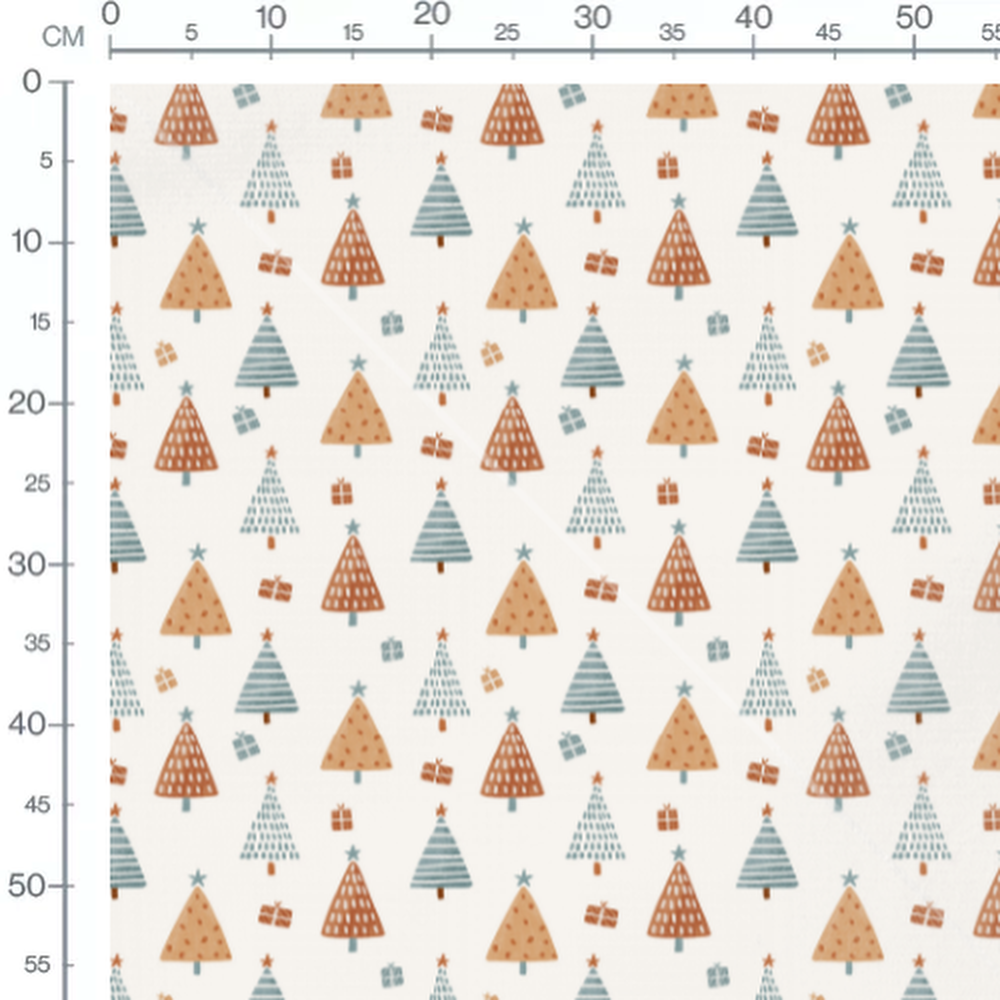 Les sapins sont décorés de motifs géométriques. Les cadeaux sont de différentes tailles et couleurs.Les tissus
