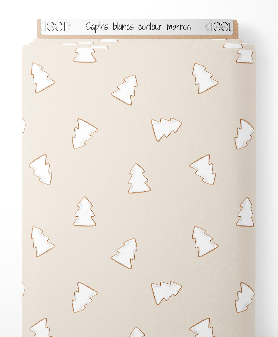 Les sapins sont dessinés avec un contour marron fin. Le fond beige met en valeur le motif simple et épuré.Les tissus