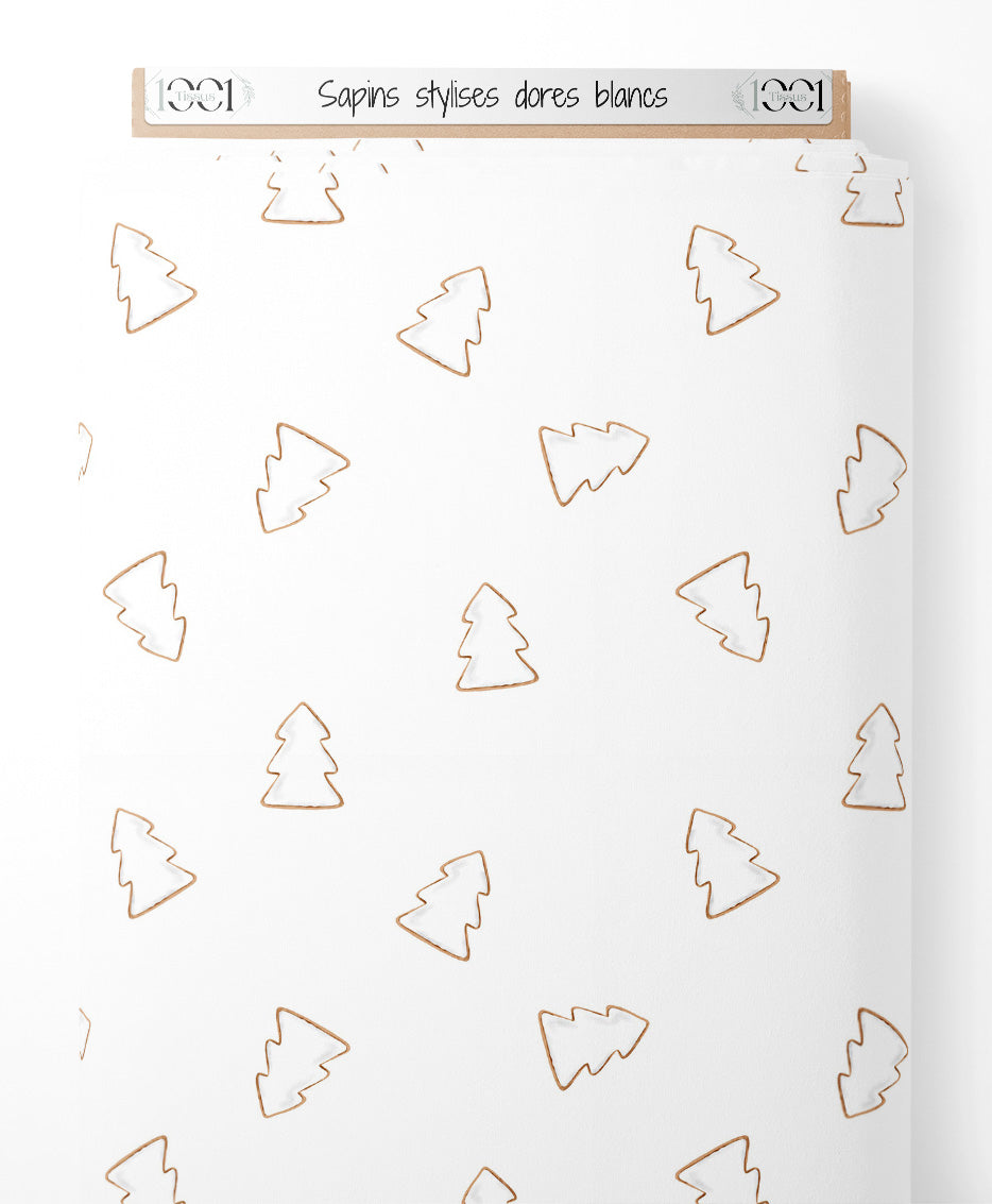 Sapins contour doré sur fond blanc. Motif répétitif de sapins stylisés.Les tissus