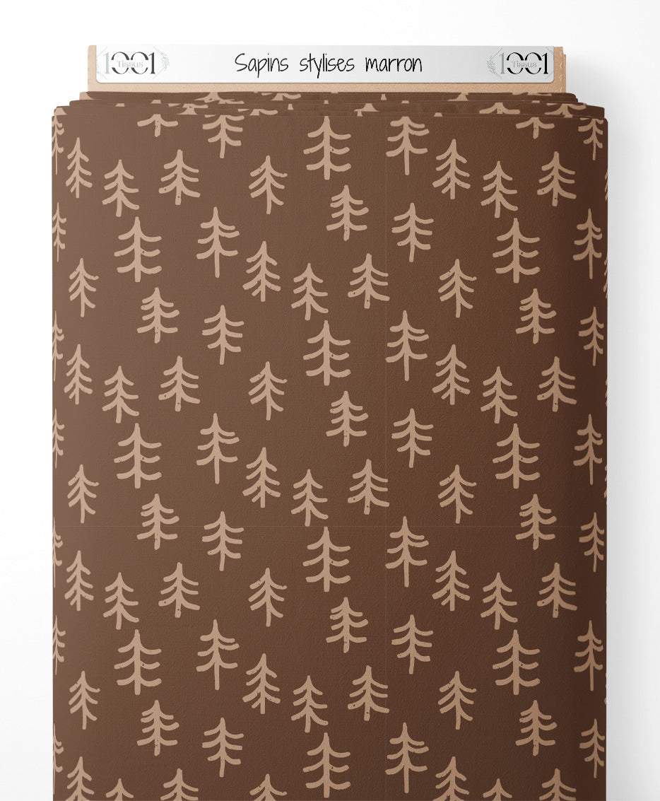 Les sapins sont dessinés de manière simplifiée et uniforme. Le fond marron met en valeur les silhouettes des arbres. Ce motif évoque une ambiance forestière minimaliste.Les tissus