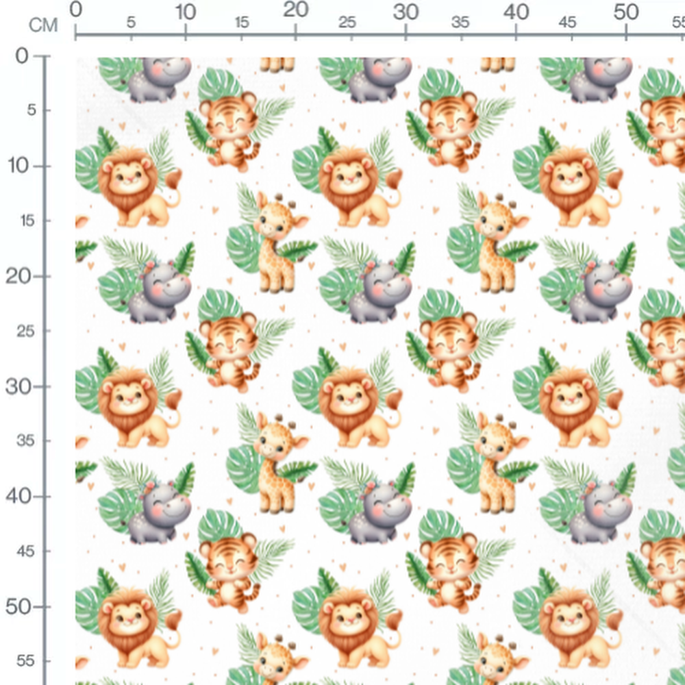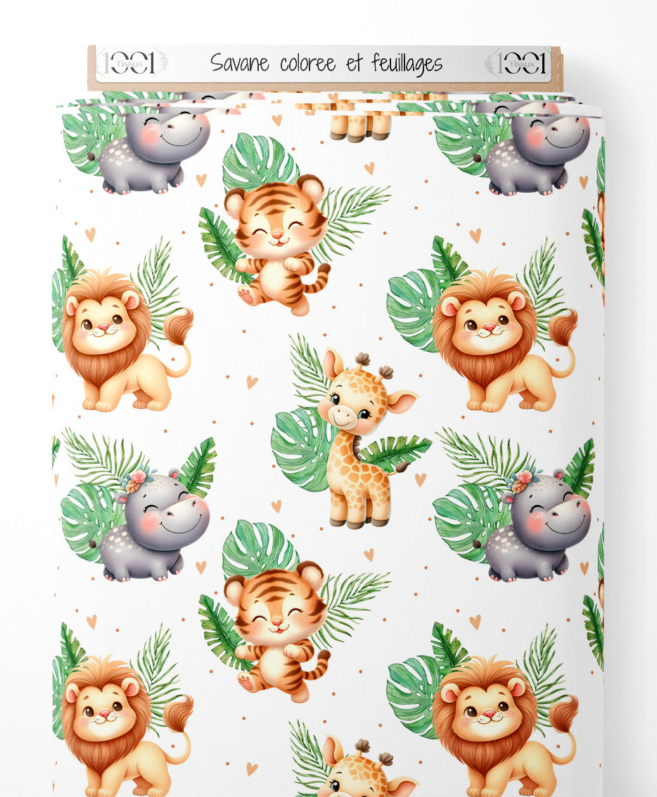 Les animaux sont dessinés avec des expressions joyeuses. Les feuilles tropicales ajoutent une touche de verdure au motif. De petits cœurs orange parsèment le fond blanc.Les tissus