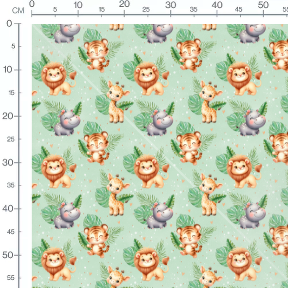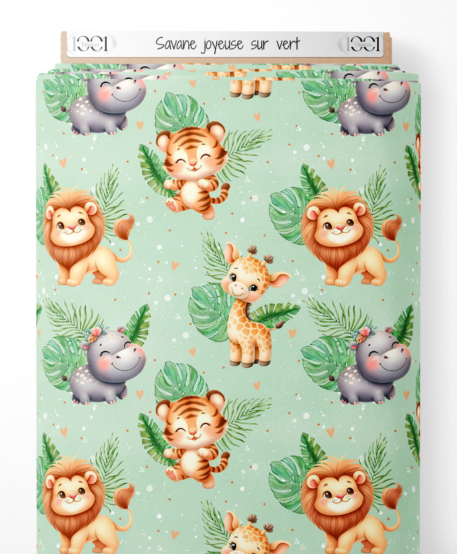 Un lion, un tigre, une girafe et un hippopotame souriants. Petits cœurs et points blancs ajoutent des détails au fond vert.Les tissus