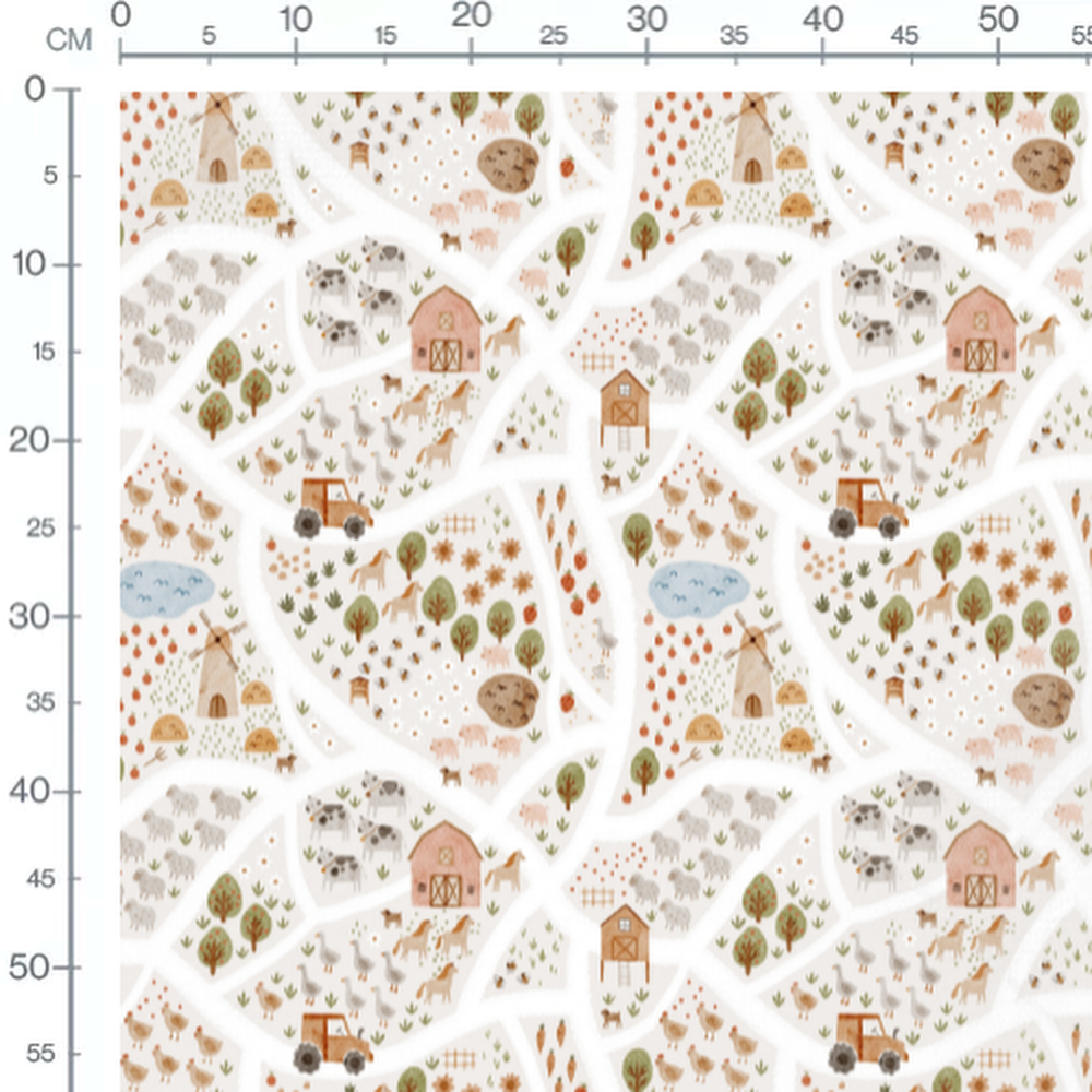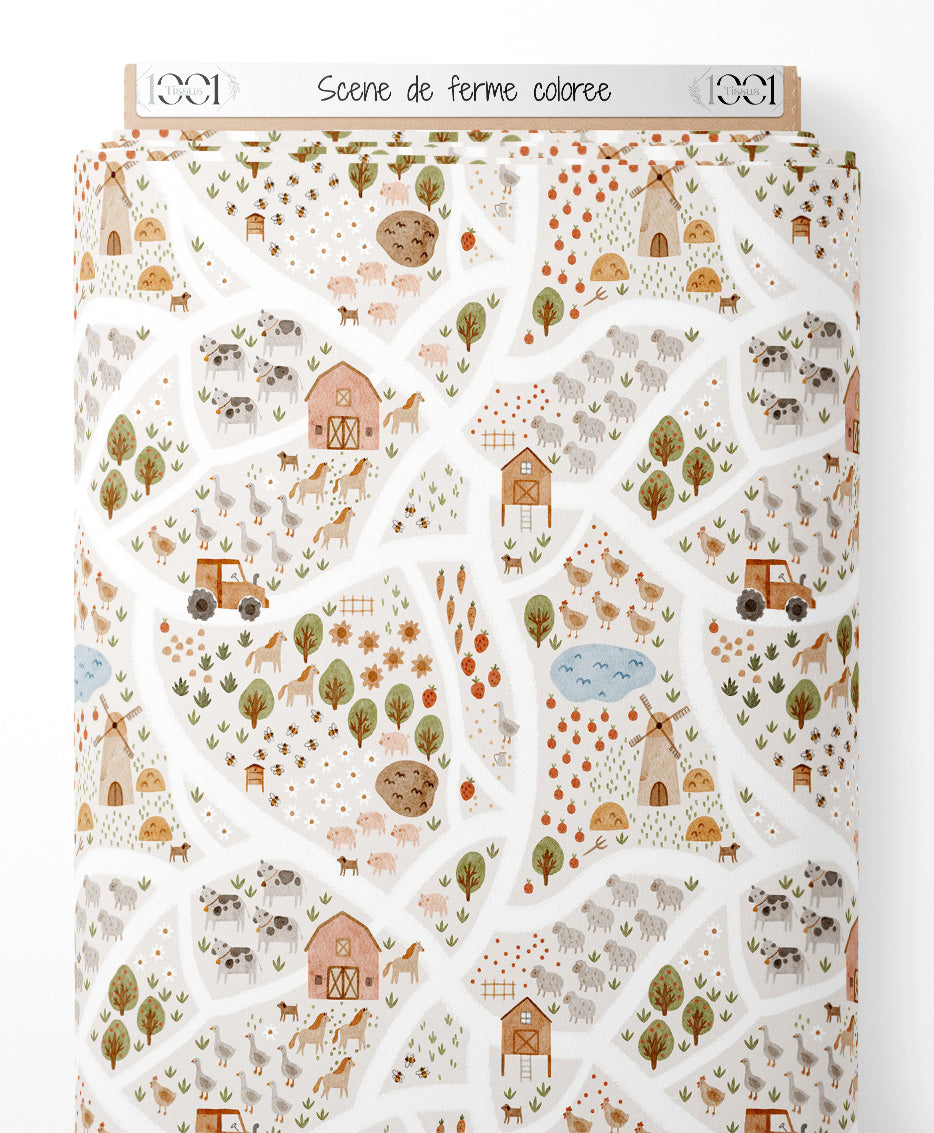 Moutons, vaches, cochons et chevaux illustrés dans des tons doux. Présence de bâtiments de ferme et de moulins à vent. Tracteurs et arbres dispersés dans le motif. Petits détails floraux et éléments de paysage complètent la scène.Les tissus