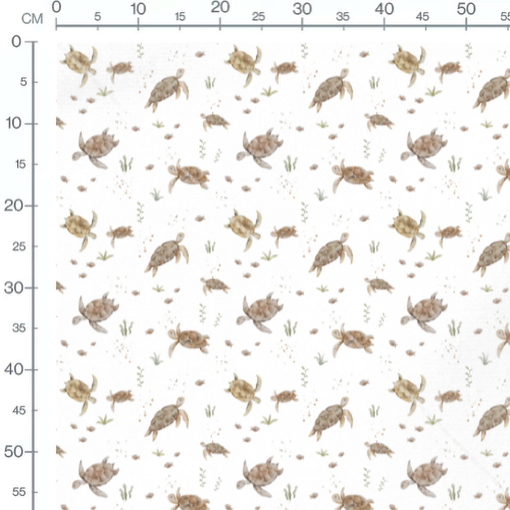 Les tortues sont de différentes tailles avec des nuances de marron. Les poissons sont petits et de couleur marron clair. Les plantes aquatiques ajoutent une touche de vert au motif.Les tissus