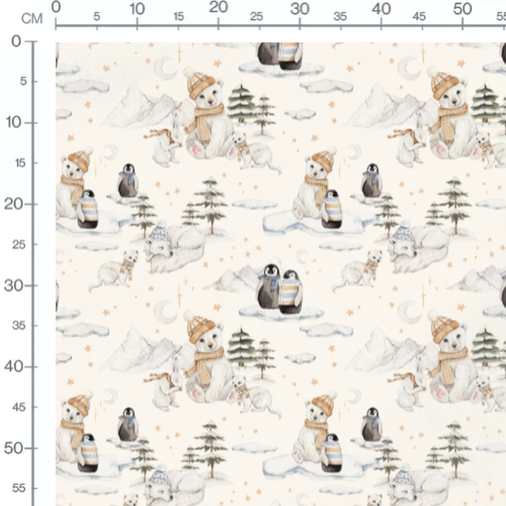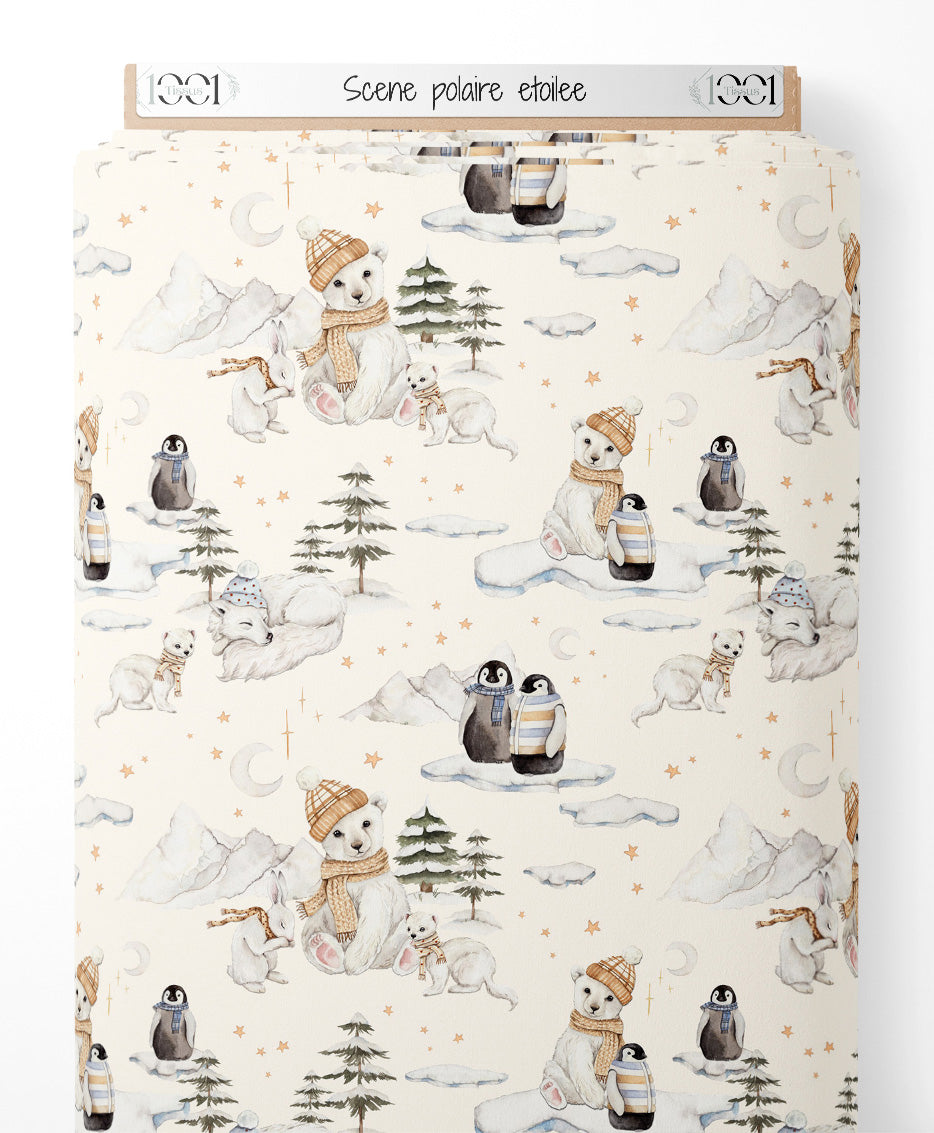 Les ours portent des bonnets et des écharpes. Les renards sont endormis ou assis paisiblement. Les pingouins sont habillés de petites écharpes colorées. Des montagnes enneigées et des sapins complètent le paysage. Des étoiles et des croissants de lune ajoutent une touche céleste.Les tissus