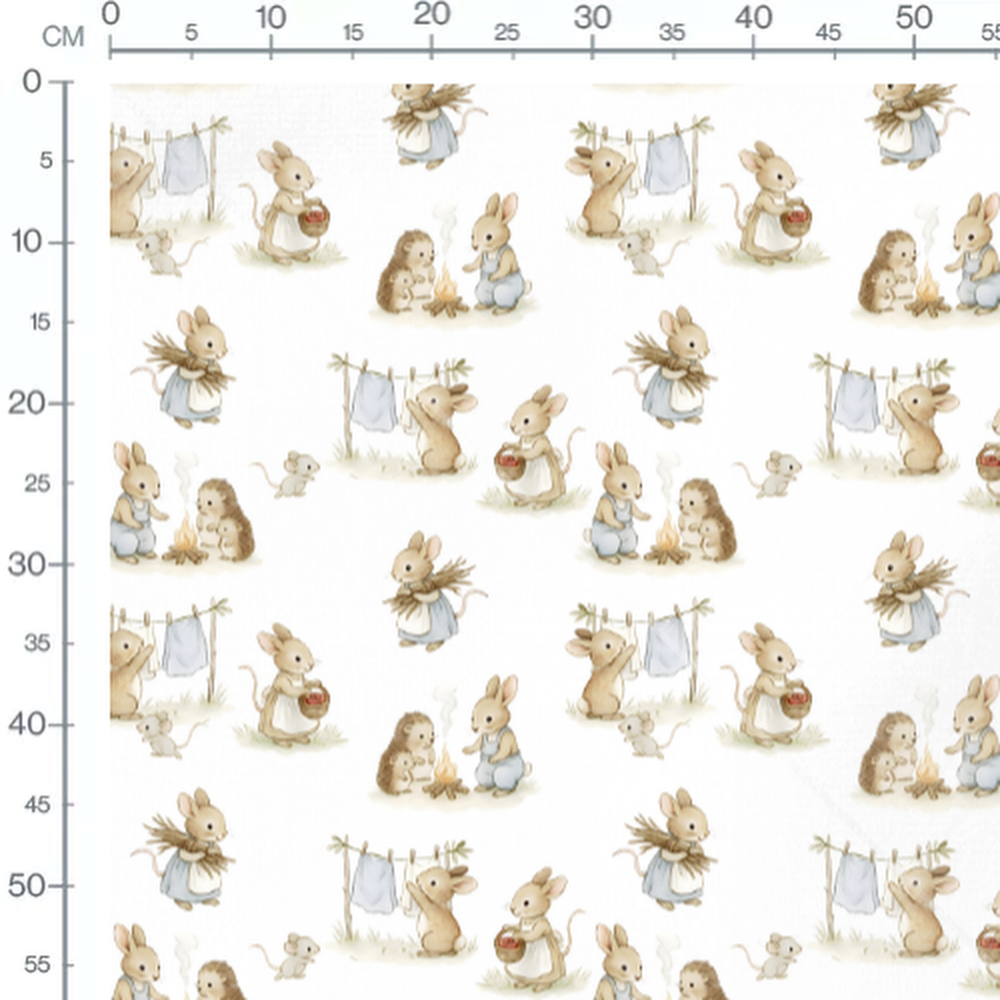 Les souris portent des vêtements simples et tiennent des objets. Les hérissons sont assis près des feux de camp. Le linge est suspendu sur une corde.Les tissus