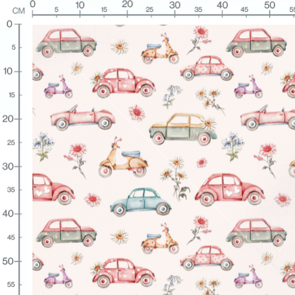 Les voitures sont de différentes couleurs pastel comme le rouge, le bleu et le vert. Les scooters ajoutent une touche de charme avec leurs teintes douces. Les fleurs incluent des marguerites et des fleurs sauvages. Le fond crème met en valeur les motifs colorés.Les tissus