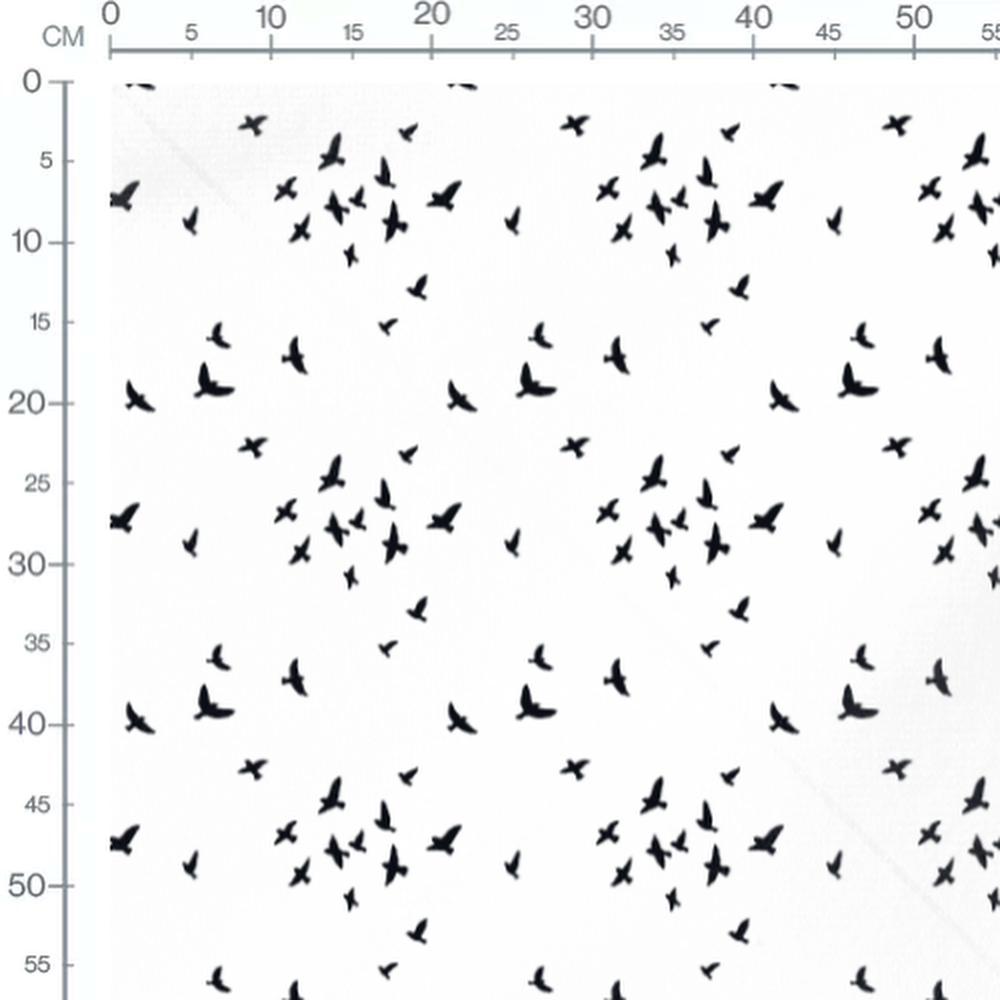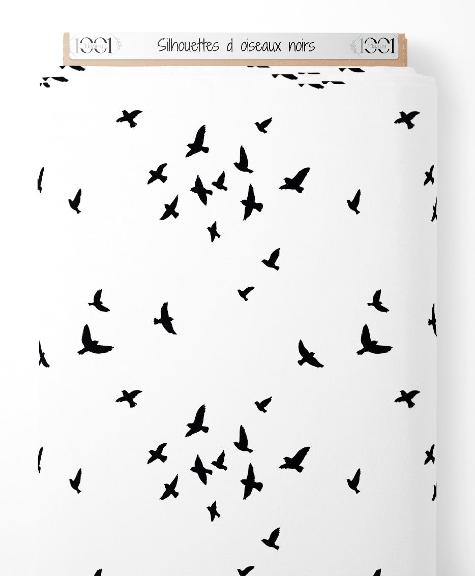 Les oiseaux sont de tailles variées, dispersés sur le fond. Le contraste entre le noir des oiseaux et le blanc du fond crée un effet visuel saisissant.Les tissus