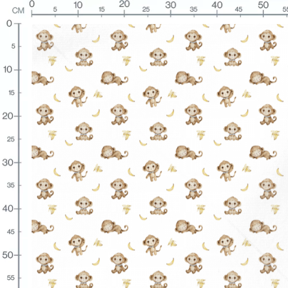 Les singes sont dessinés dans des positions variées, certains assis et d'autres allongés. Les bananes sont représentées en grappes et individuellement, ajoutant une touche ludique au motif.Les tissus