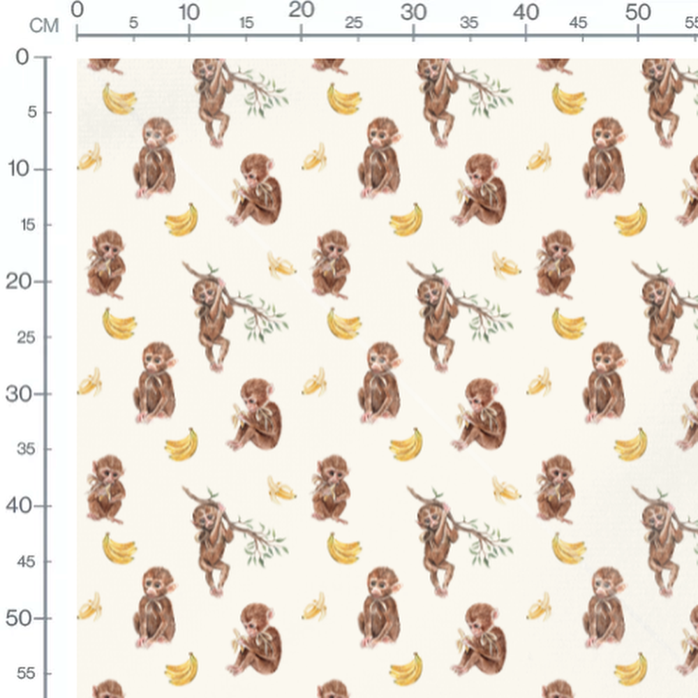 Les singes sont représentés dans différentes positions, certains tenant des bananes. Les bananes sont jaunes et les feuilles sont vertes, ajoutant une touche de nature au motif.Les tissus