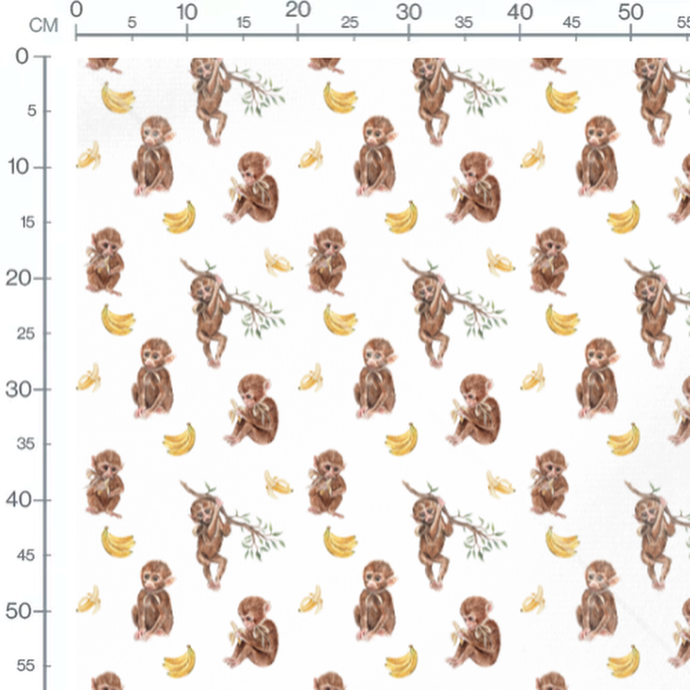 Les singes sont représentés dans différentes positions, certains tenant des bananes. Les bananes sont en grappes ou épluchées, ajoutant une touche de couleur vive. Les feuilles vertes apportent une touche naturelle au motif.Les tissus