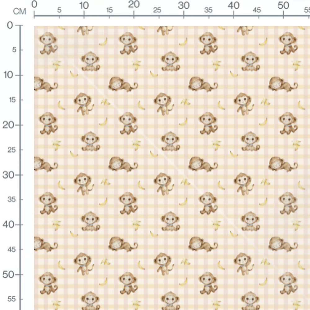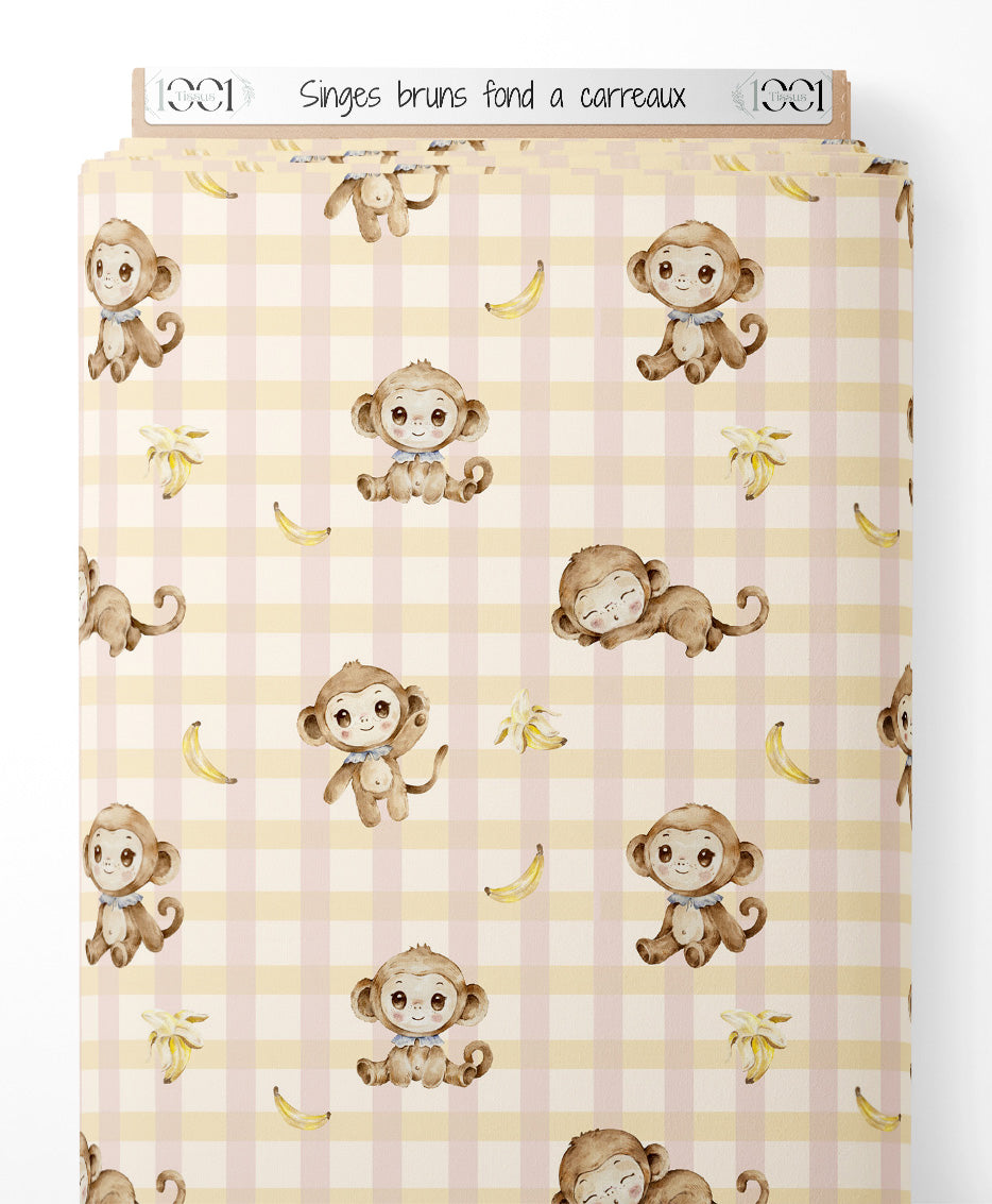 Les singes ont des expressions joyeuses et sont accompagnés de bananes. Le fond à carreaux beige ajoute une touche douce et chaleureuse. Les bananes sont de différentes tailles et positions.Les tissus