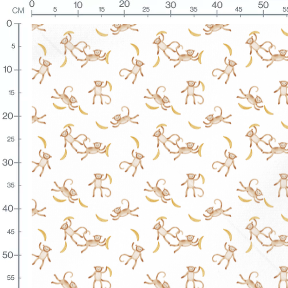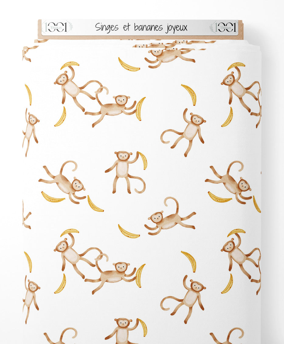 Les singes tiennent des bananes ou semblent jouer avec elles. Les bananes sont d'un jaune vif contrastant avec le fond blanc. Les singes ont des expressions amusantes et variées.Les tissus