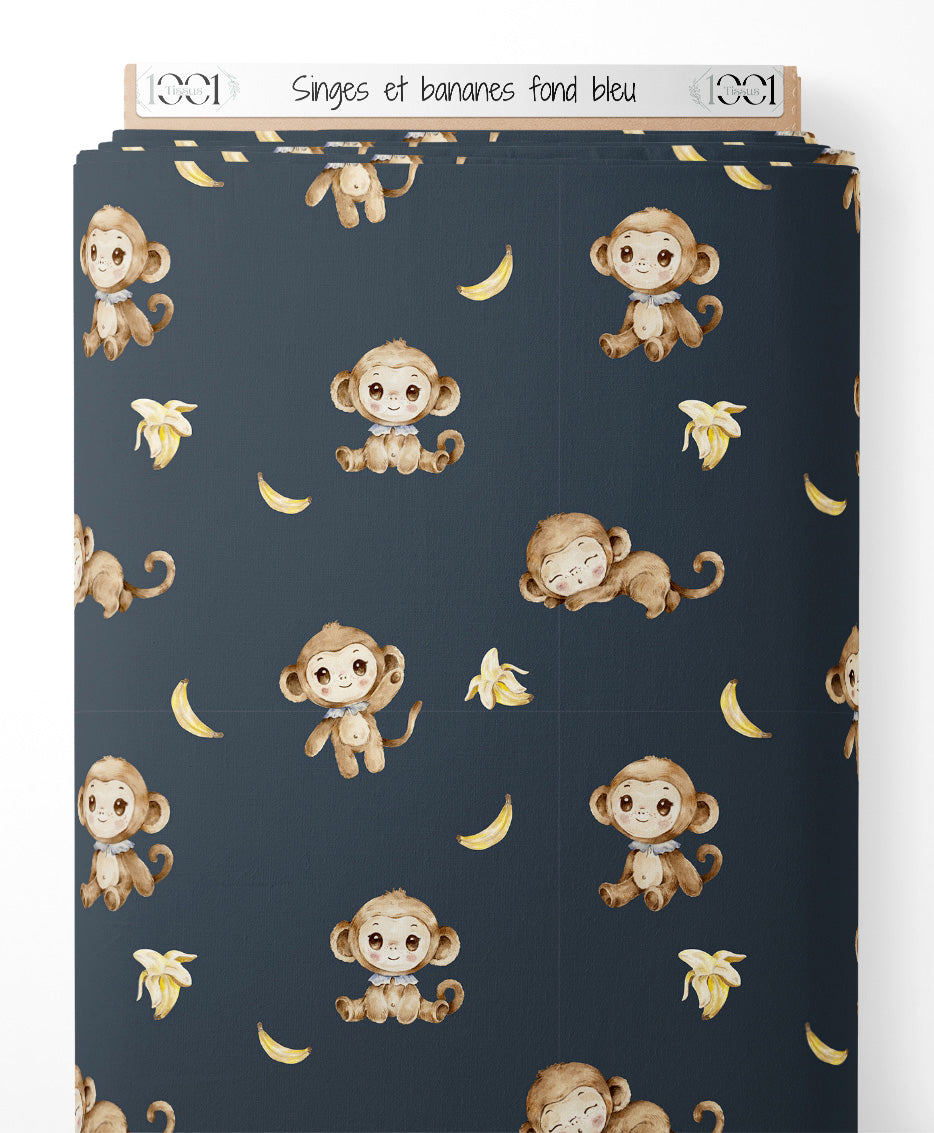 Les bananes sont dispersées autour des singes. Les singes ont des détails doux et des expressions amicales.Les tissus