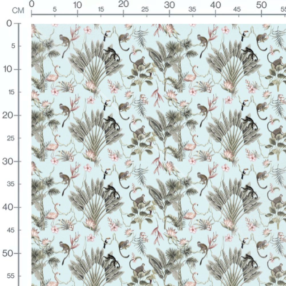 Les singes grimpent sur des branches entourées de grandes feuilles vertes. Des oiseaux noirs se posent parmi les fleurs roses délicates. Le fond bleu clair met en valeur les éléments tropicaux du motif.Les tissus
