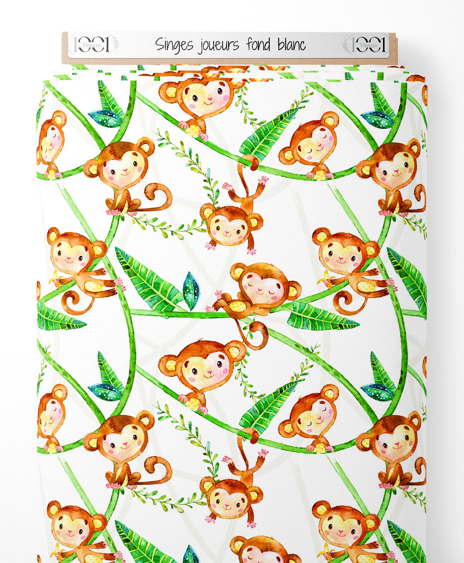 Les singes tiennent des lianes vertes et semblent jouer. Les feuilles sont de différentes nuances de vert, ajoutant de la vivacité au motif.Les tissus