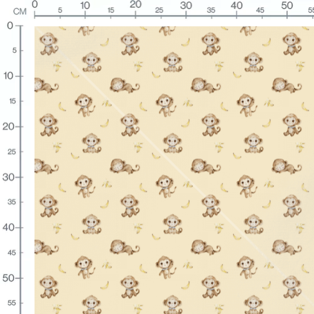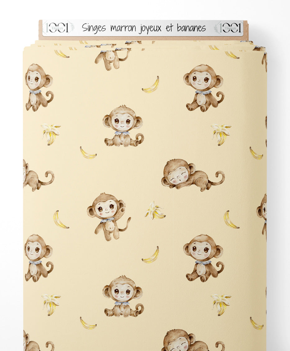 Les singes sont dessinés dans un style aquarelle avec des expressions joyeuses. Les bananes sont dispersées entre les singes, ajoutant une touche ludique au motif.Les tissus