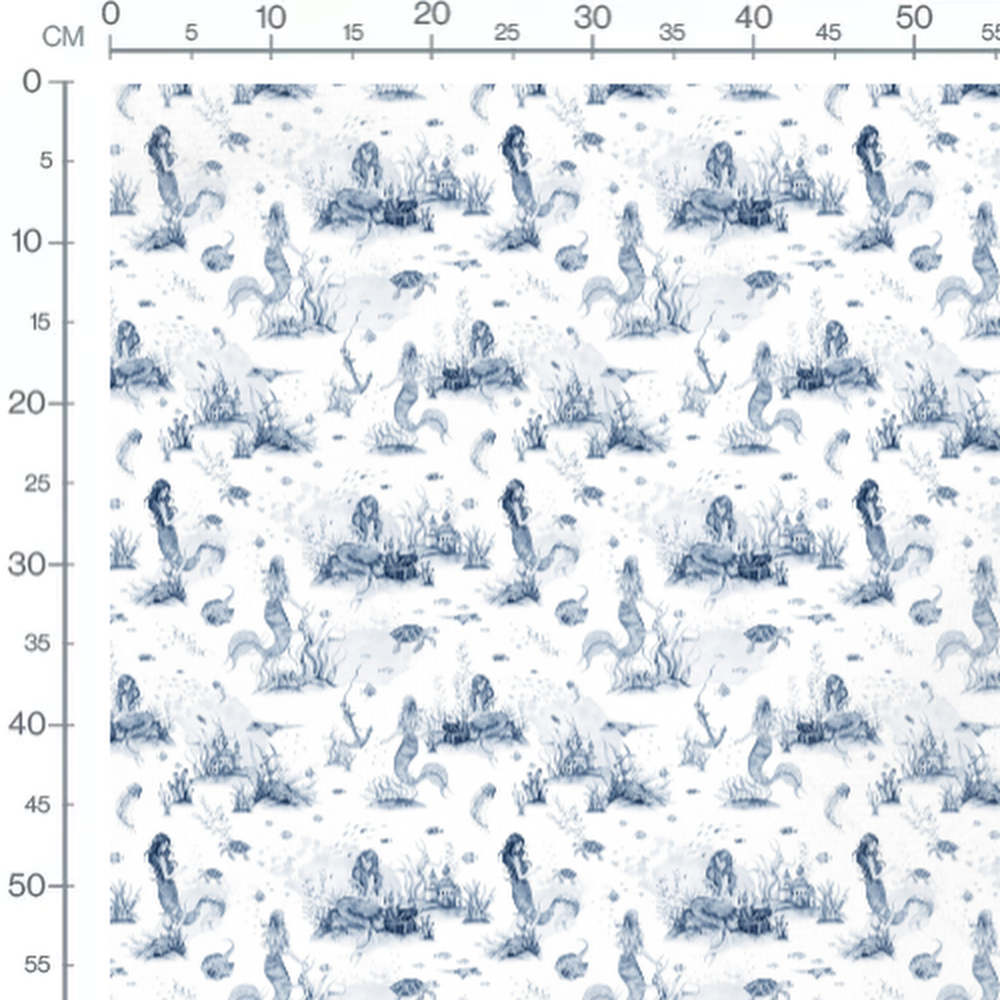 Des tortues et des raies nagent autour des sirènes. Des poissons et des algues ajoutent des détails marins. Des châteaux sous-marins se dressent parmi les coraux.Les tissus