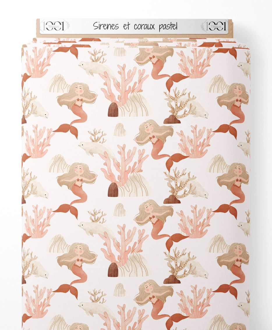 Les sirènes souriantes sont entourées de coraux aux teintes douces. Les phoques blancs ajoutent une touche marine. Les algues brunes et les coraux créent un environnement sous-marin apaisant.Les tissus