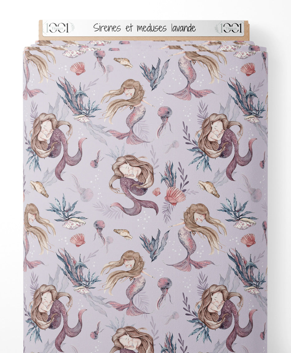 Les sirènes sont illustrées avec des queues scintillantes et des cheveux flottants. Les méduses sont délicatement dessinées avec des nuances de rose et de violet. Des coquillages variés et des algues bleutées ajoutent une touche marine. Le fond lavande crée une ambiance douce et onirique.Les tissus