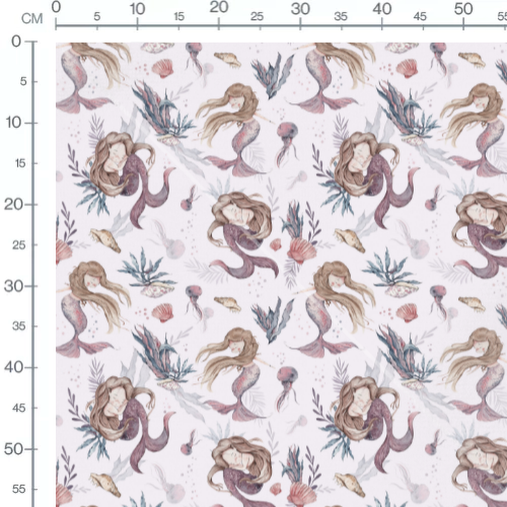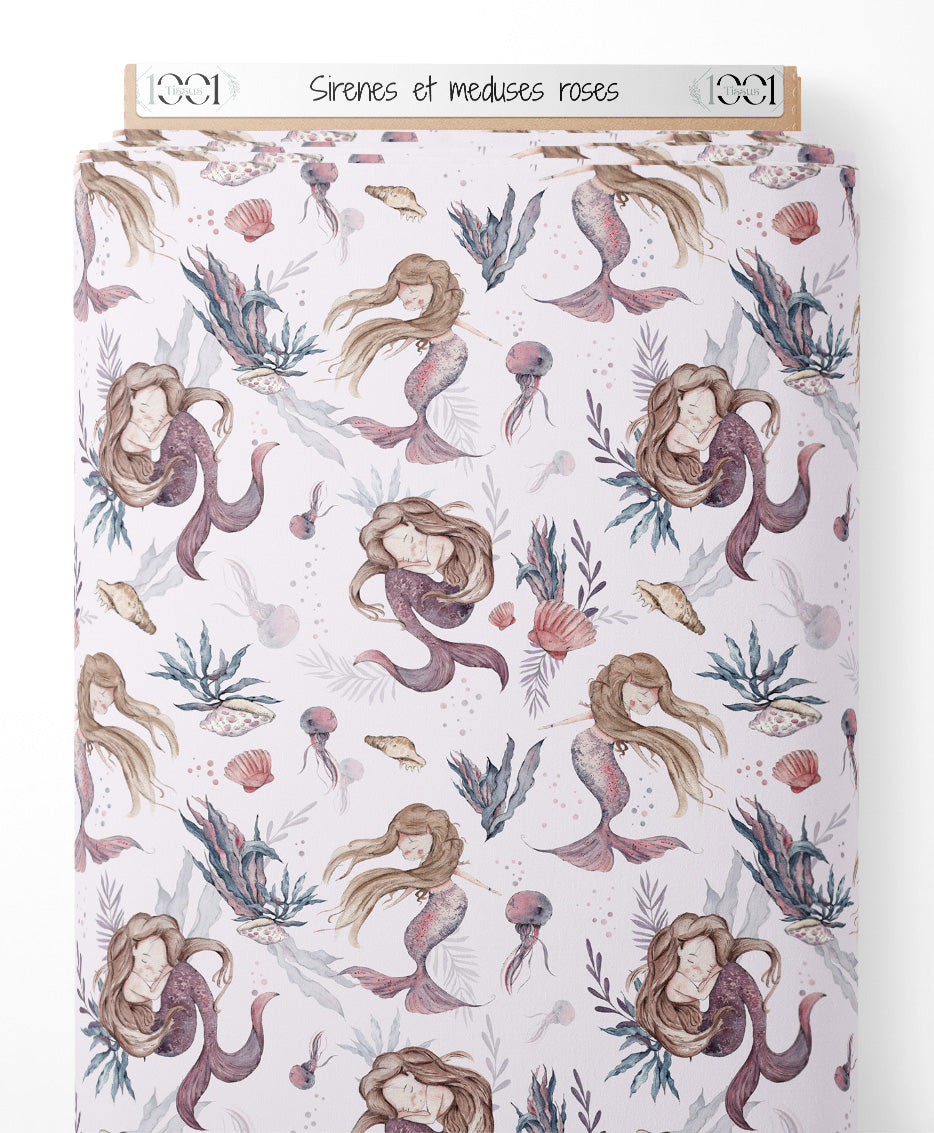 Les sirènes ont des queues violettes et des cheveux bruns flottants. Les méduses sont délicatement dessinées en rose et violet. Des coquillages beige et rose ajoutent une touche marine. Les algues sont illustrées en nuances de bleu et vert.Les tissus