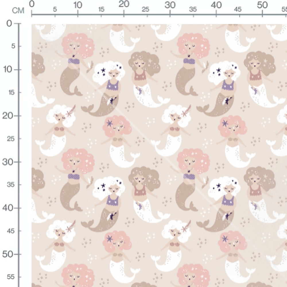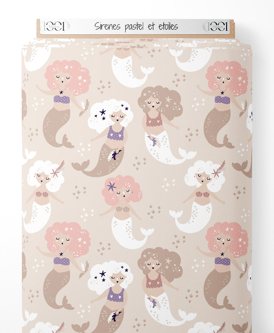 Les sirènes ont des cheveux roses, blancs et bruns. Elles portent des hauts de maillot et tiennent des étoiles de mer. Le fond beige est parsemé de petites étoiles et motifs marins.Les tissus