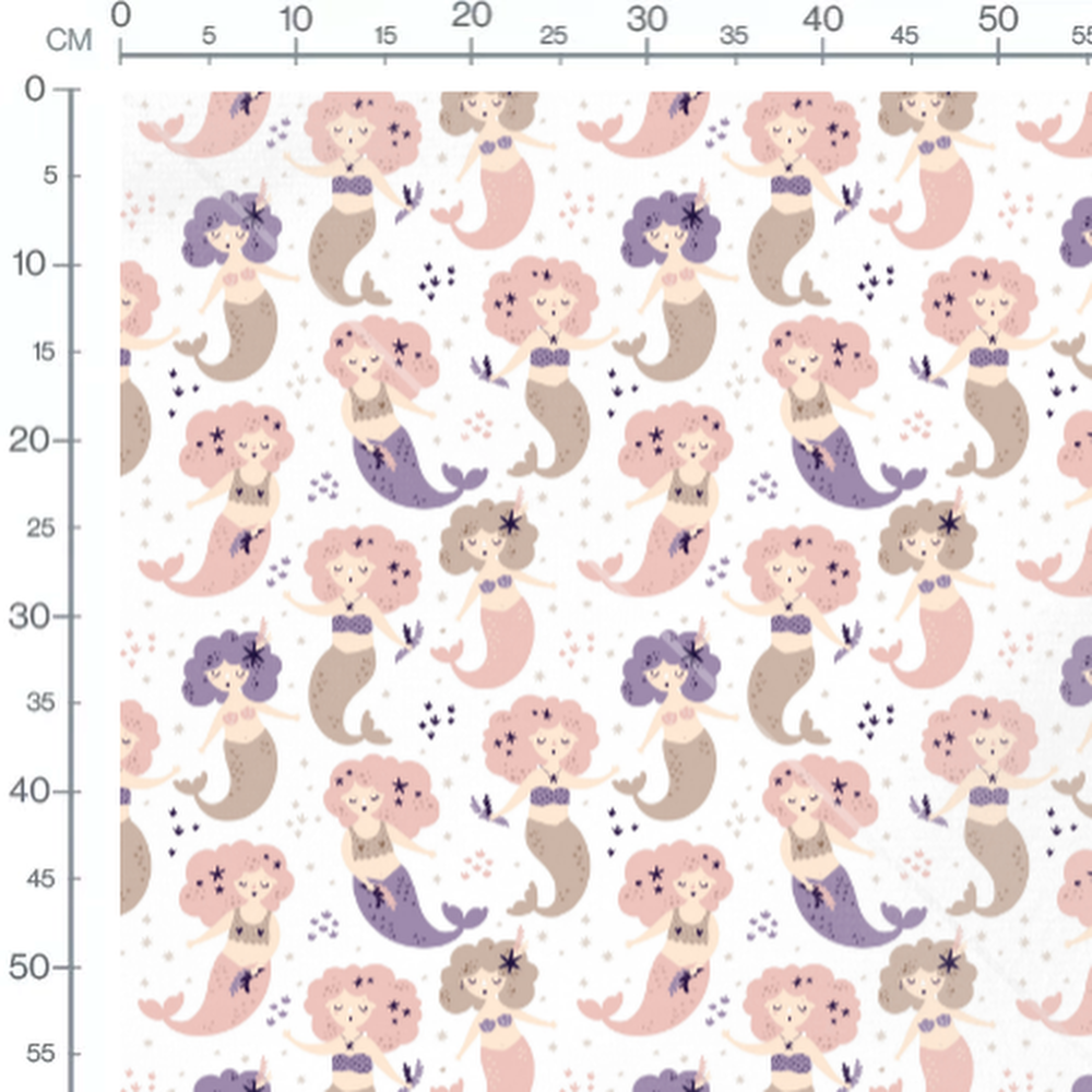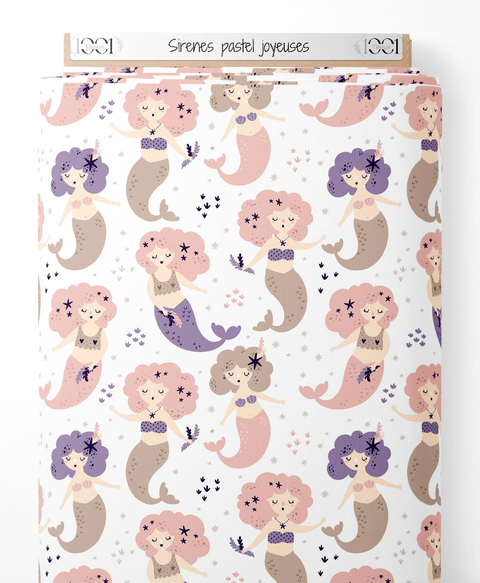 Les sirènes ont des queues dans des tons de rose, beige et violet. Leurs cheveux bouclés sont ornés d'étoiles de mer. De petites plantes marines violettes et noires complètent le motif.Les tissus