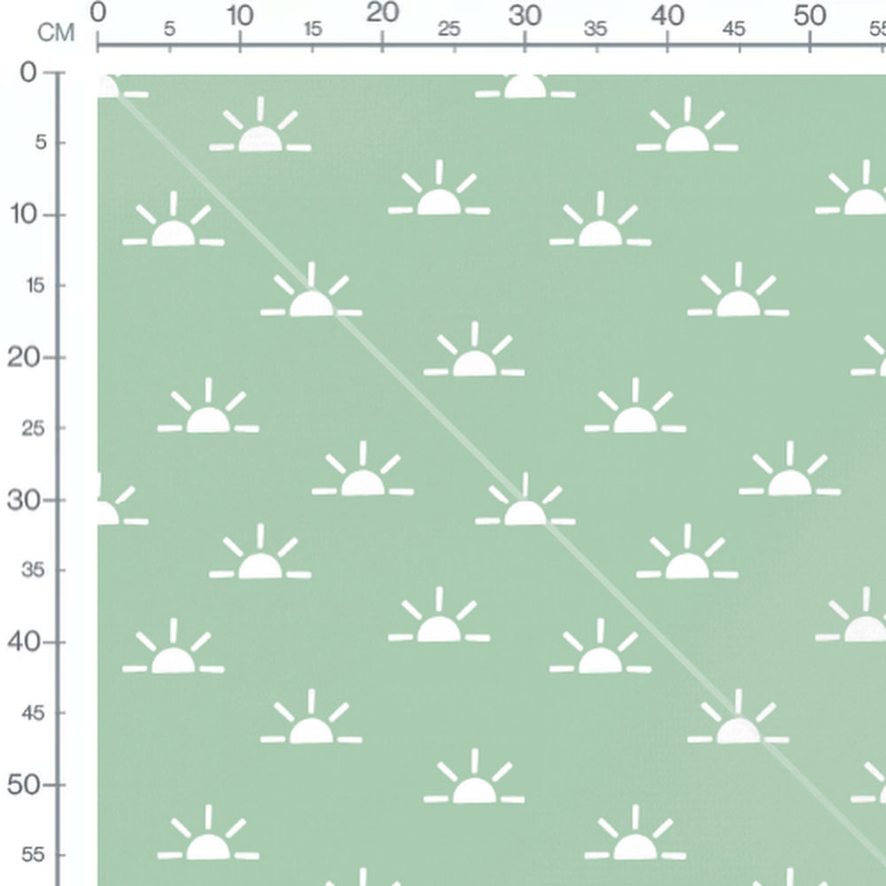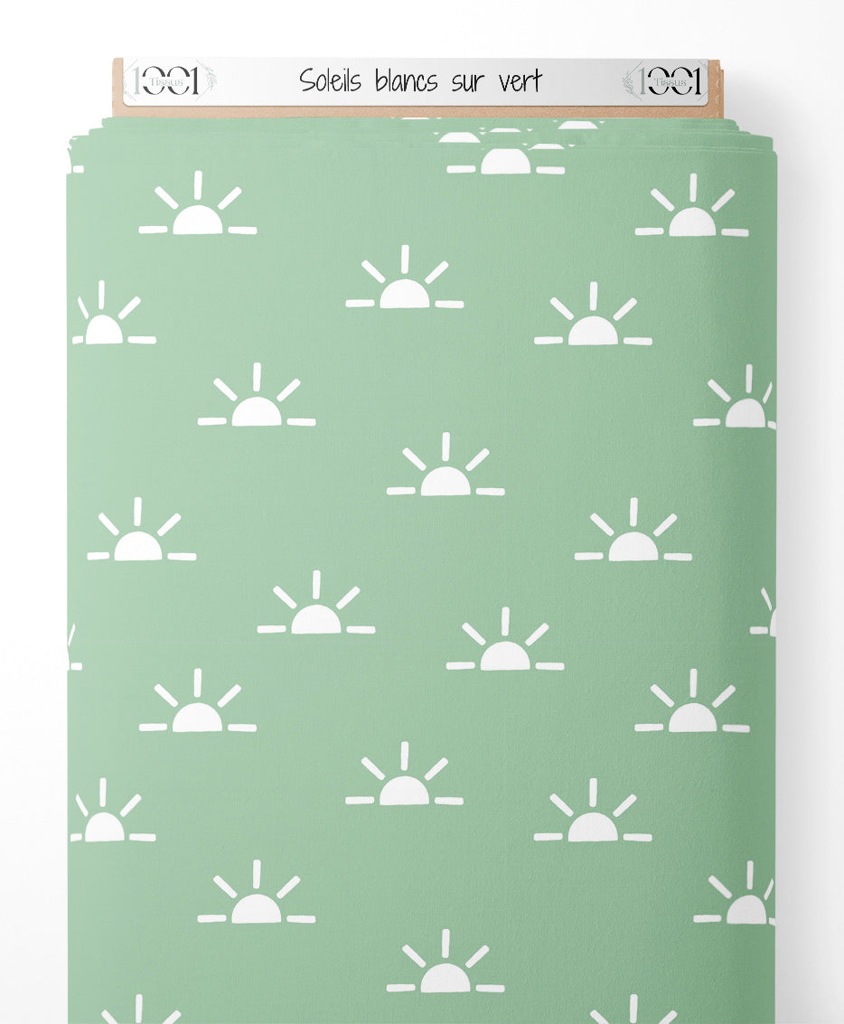 Les soleils sont représentés par des demi-cercles blancs avec des rayons émanant. Le fond vert pastel apporte une touche douce et naturelle.Les tissus