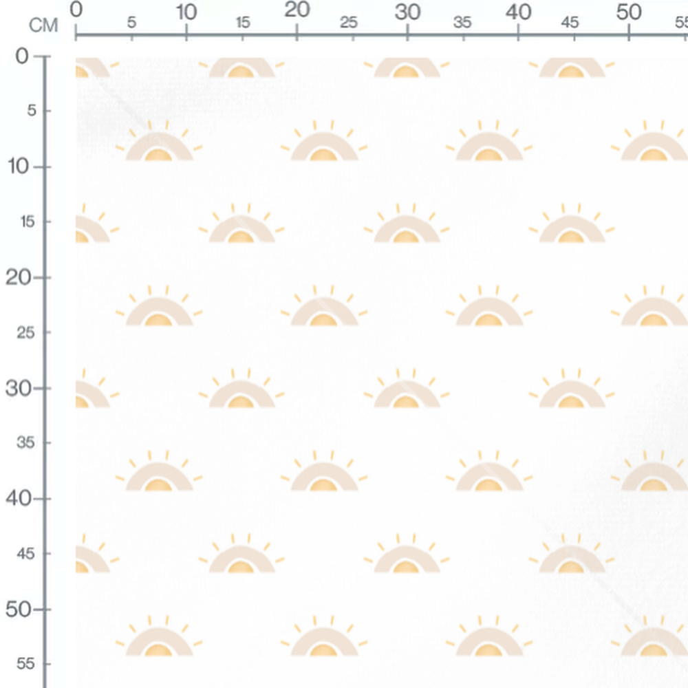 Les demi-cercles sont entourés de petits traits jaunes représentant des rayons. Le fond blanc met en valeur le motif simple et épuré.Les tissus