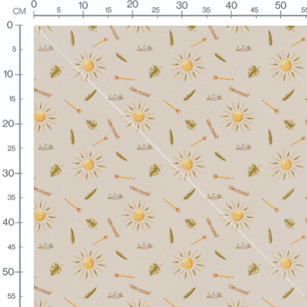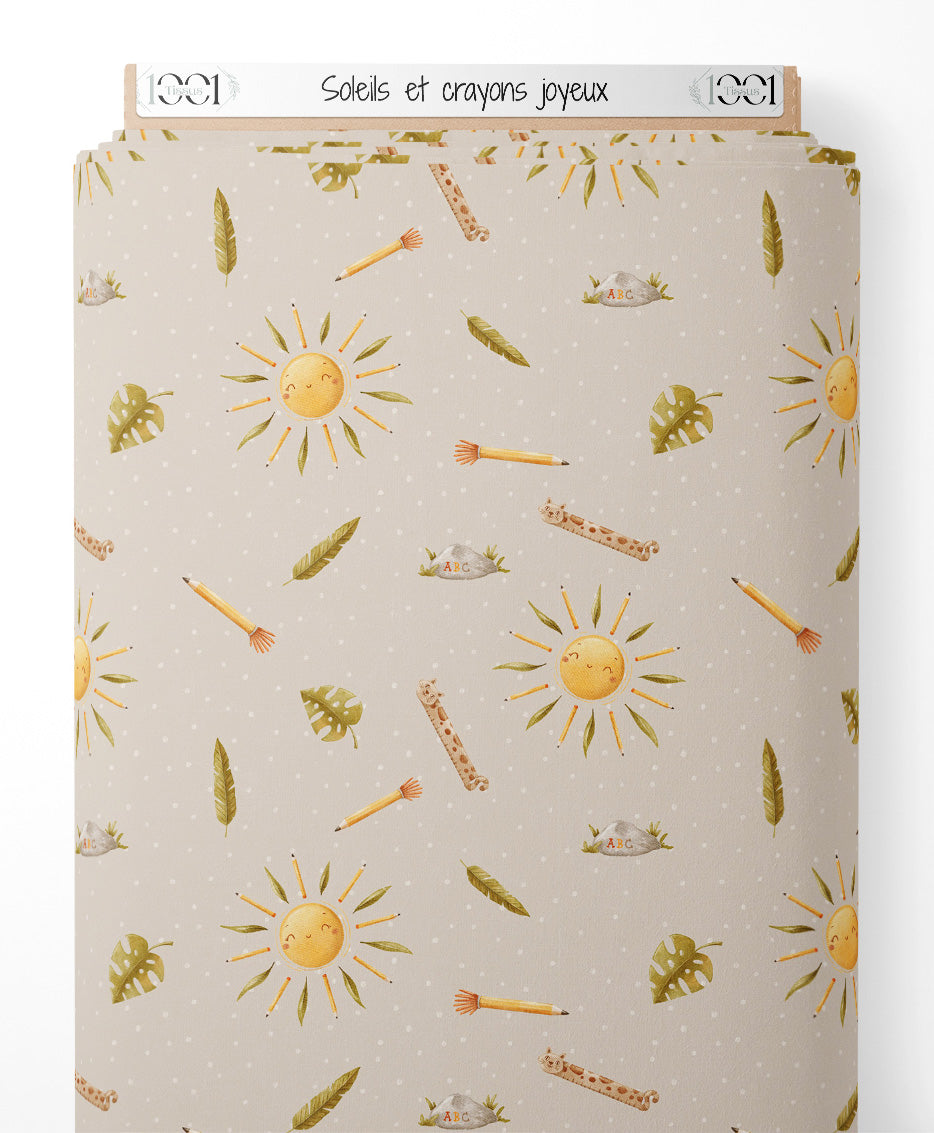Les soleils ont des visages souriants entourés de rayons dorés. Les crayons sont de couleur jaune avec des pointes grises. Des feuilles vertes et des pierres avec des lettres ABC ajoutent une touche éducative.Les tissus