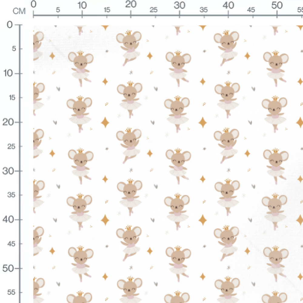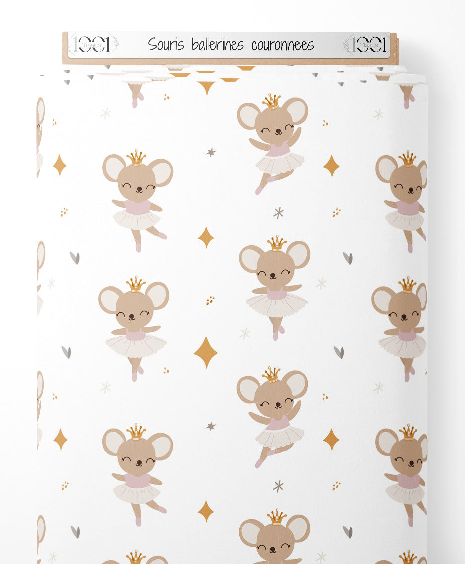 Les souris portent des tutus blancs et des couronnes dorées. Des petites étoiles grises et des losanges dorés complètent le motif. Les souris sont dessinées dans des tons doux de beige et rose.Les tissus